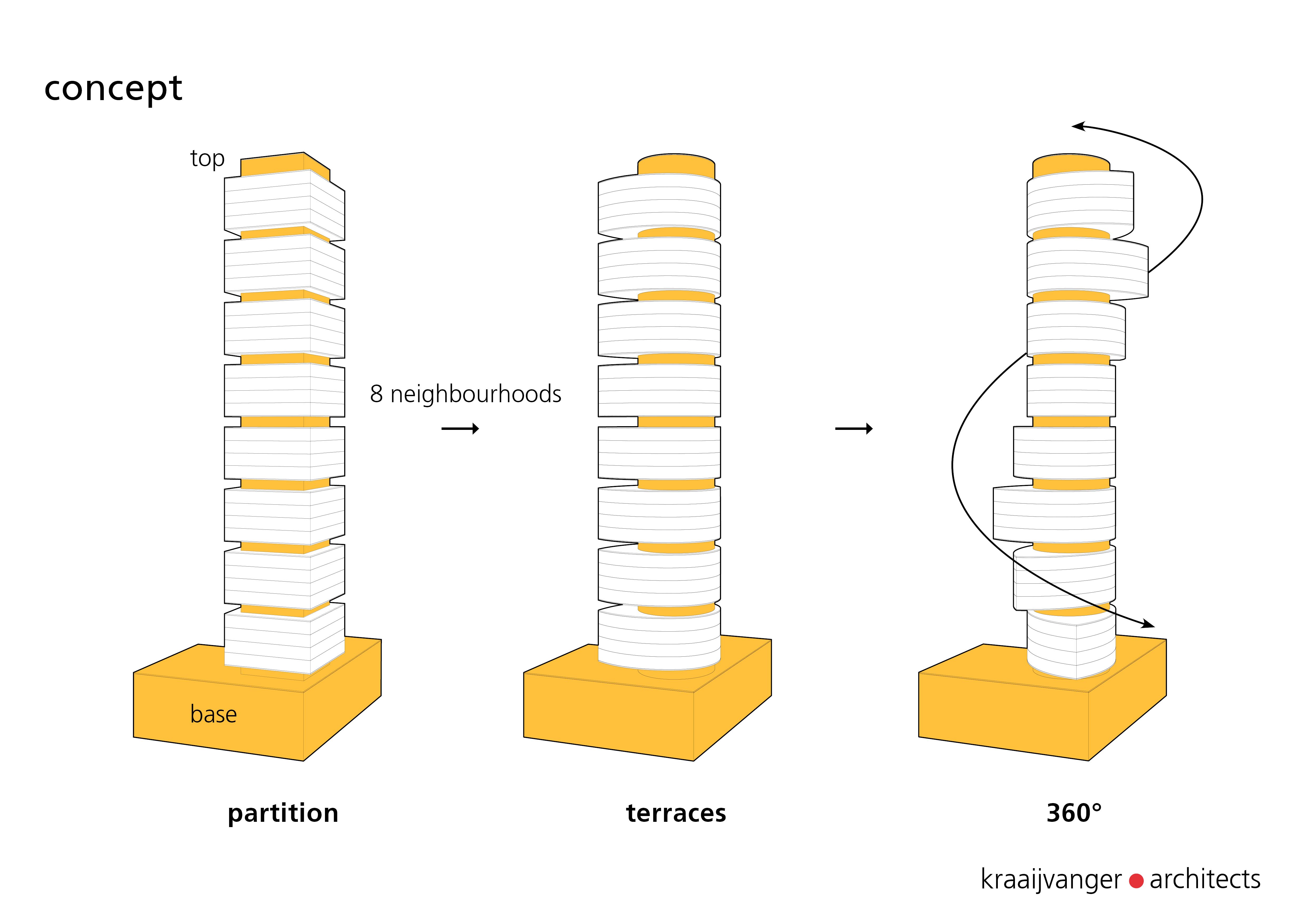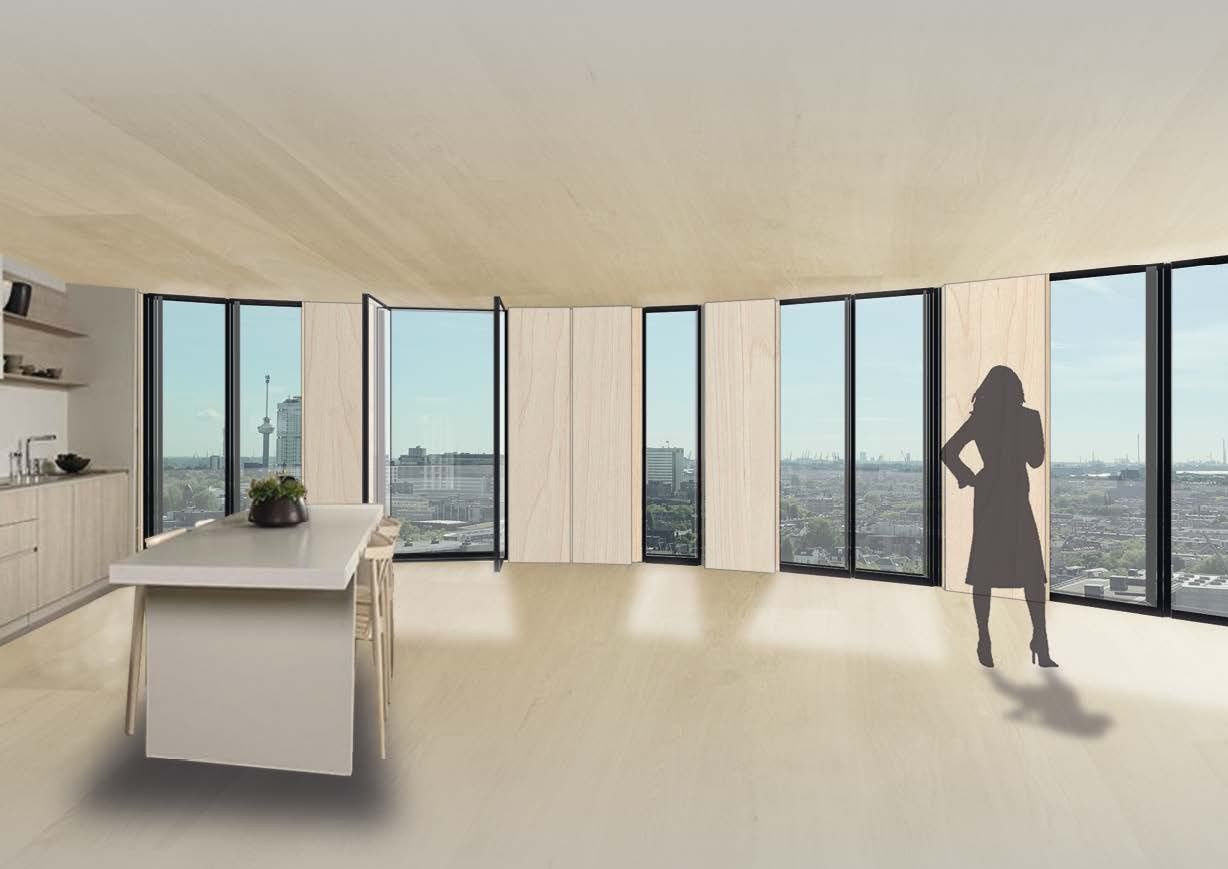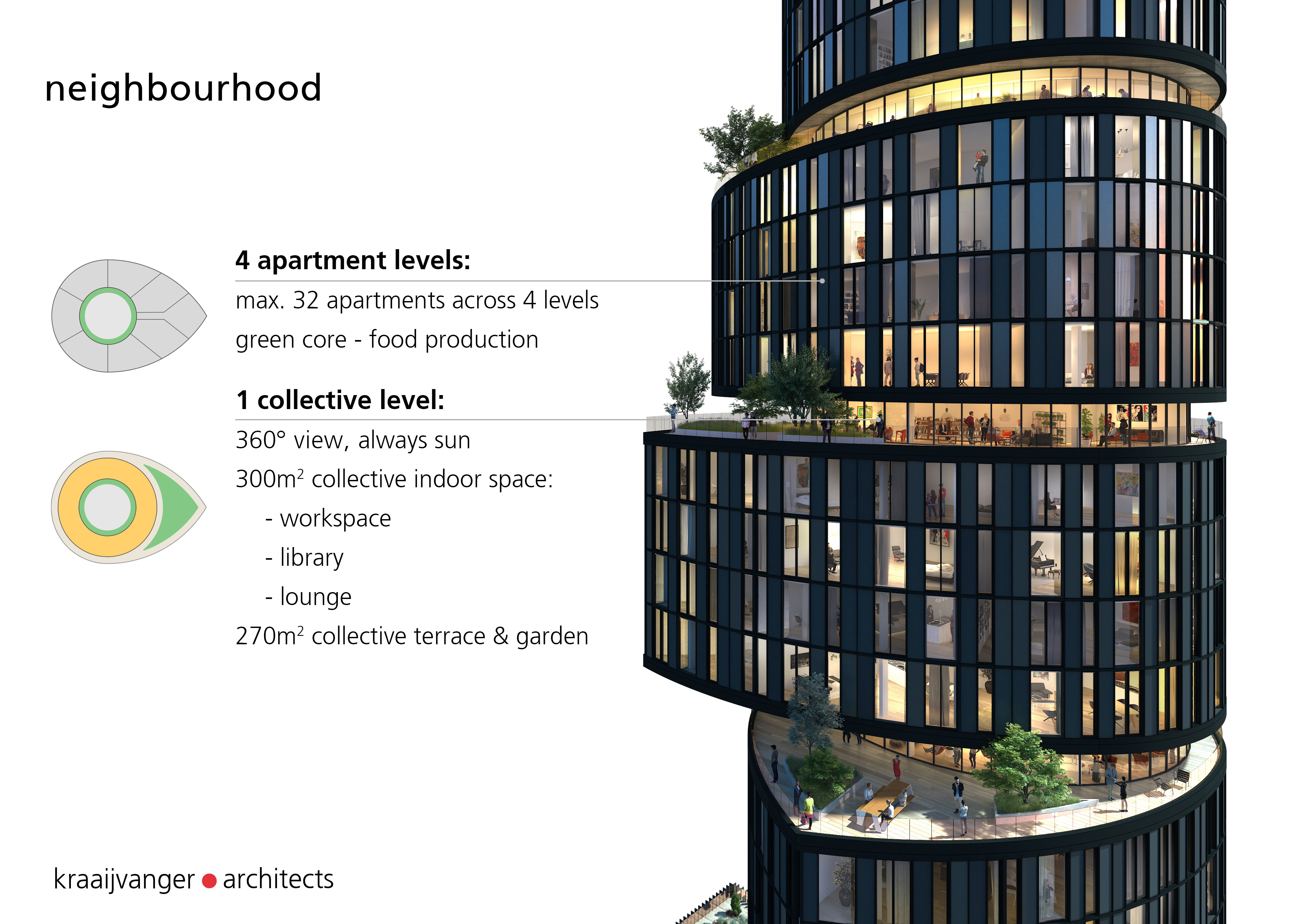 Most people like to contribute to the circular economy as long as it doesn’t take too much time and money. The 360° concept offers an effortless and sustainable lifestyle. The building provides 100% sustainable energy, it filters the city air and its constructed with recycled materials. Local produce, easy waste separation and sustainable mobility are all part of the service. A vertical garden for growing vegetables is situated around the structural core and extends over the full height of the building. DIY tools and kitchen equipment are available at a communal tool warehouse.