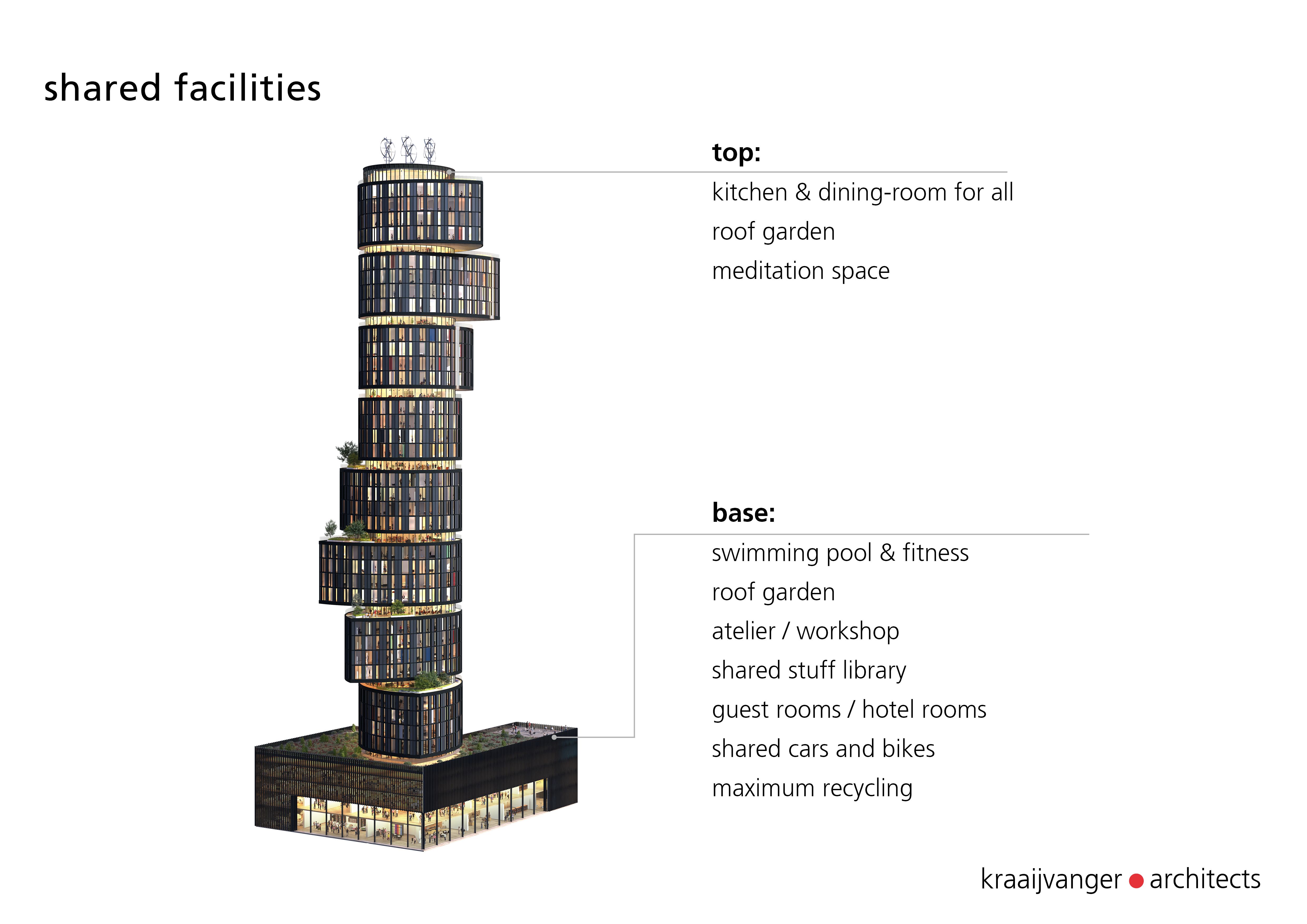 This level of innovation can only be achieved through a critical, integrated approach where each participant is fully involved in the design and construction stages. Initially we asked our design partners to contribute to our expertise in all aspects of the project for a sustainable architecture. We worked with Motivaction to analyze the demand for this type of project and contacted various groups of builders and suppliers. We met with groups that were keen to share tools, equipment and facilities. We developed a structural and energy concept together with the firm of Royal Haskoning DHV. The Brink Group helped us elaborate a feasibility study on the common use of facilities and spaces.