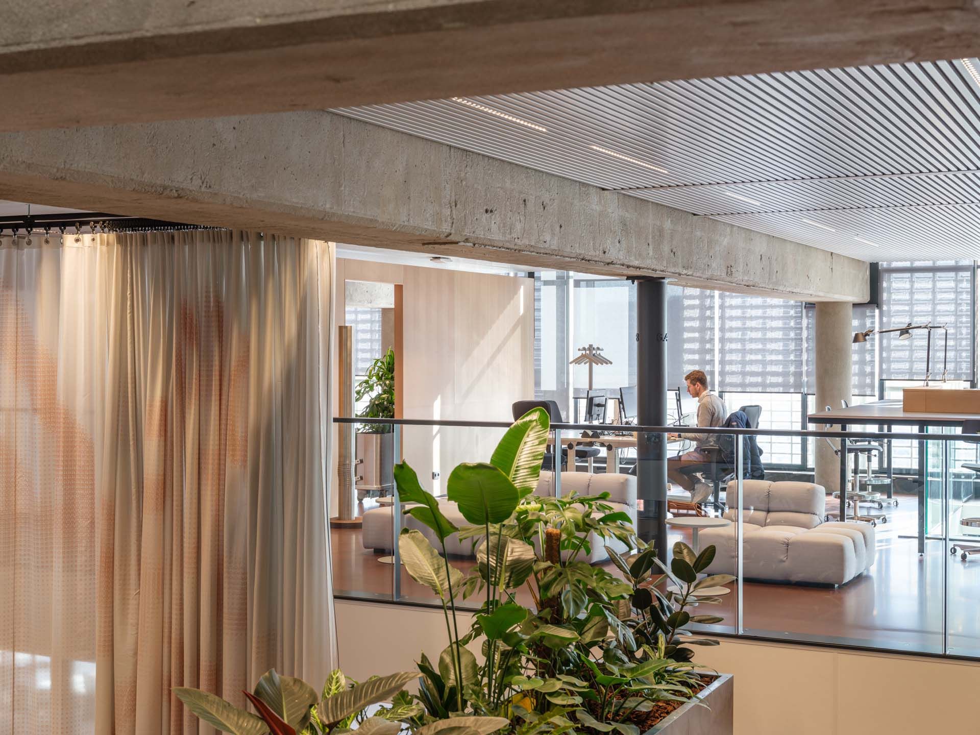 The building has a strong rhythm with bays of 5.85 m, each divided into three equal parts of 1.95 m. This rhythm determines the interior, it is the key to a comfortable, small scale of the interior. This spatial structure is a crucial element in the interior design, integrating many requirements: privacy, light transmission, acoustic attenuation, filtered transparency, zone definition, spatial effect, technical autonomy and material expression. The layout defines group sizes from 2 to 12 workstations. These clusters should not become too large, to avoid the open office landscape. The furniture reinforces the choice between collaborative or individual work, as well as diversity. The semi-transparent design of this structure will allow you to maintain togetherness in any work situation.