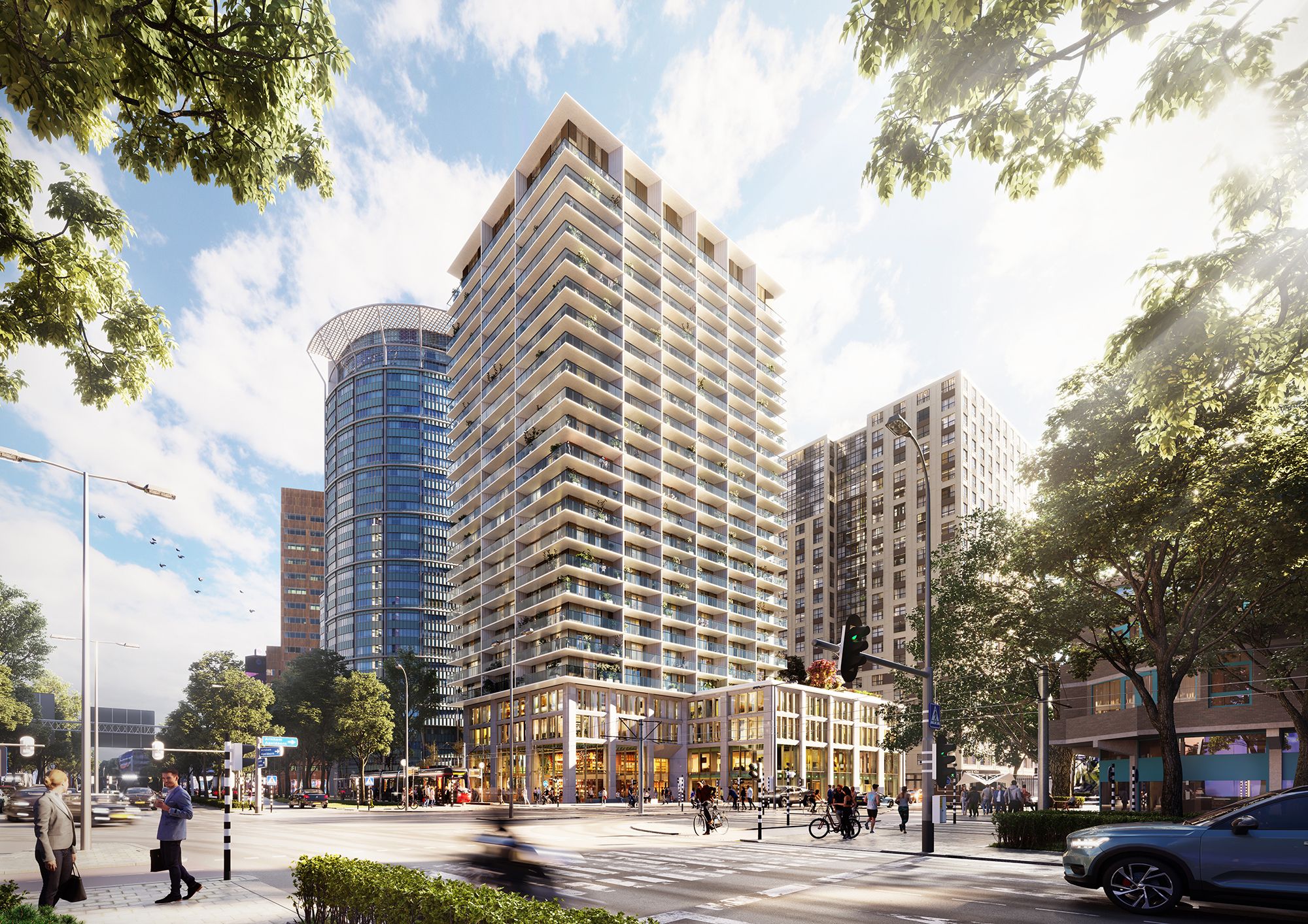From 2019-2026 the building is being redeveloped for the second time. The structure is almost completely demolished.The new block will accommodate 322 apartments on 24 floors. Since the building more than doubles in weight, the structure is peculiar: since the original piling could not be removed, it will be re-used in combination with new super-strong tubex piling, bound by a massive concrete slab in the former basement. Groundfloor and first floor contain public amenities (shops, bars, garage and a large bicycle store). On the 4 storey plinth a roof garden will be made. Continuous strips of balconies determine the perimeter of the building, offering ample outdoor space to the apartments. By flipping the privacy screens on each floor -inspired by the reliefs of Jan Schoonhoven- a too simple verticality has been avoided.