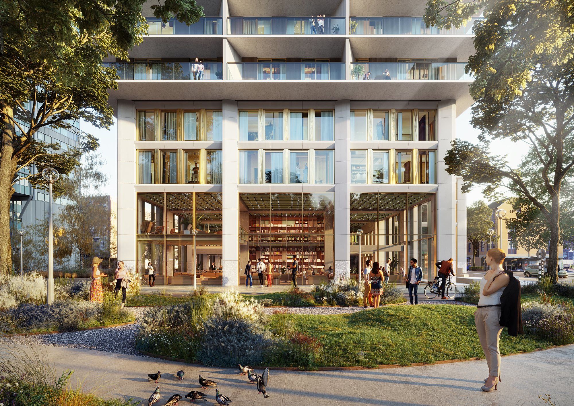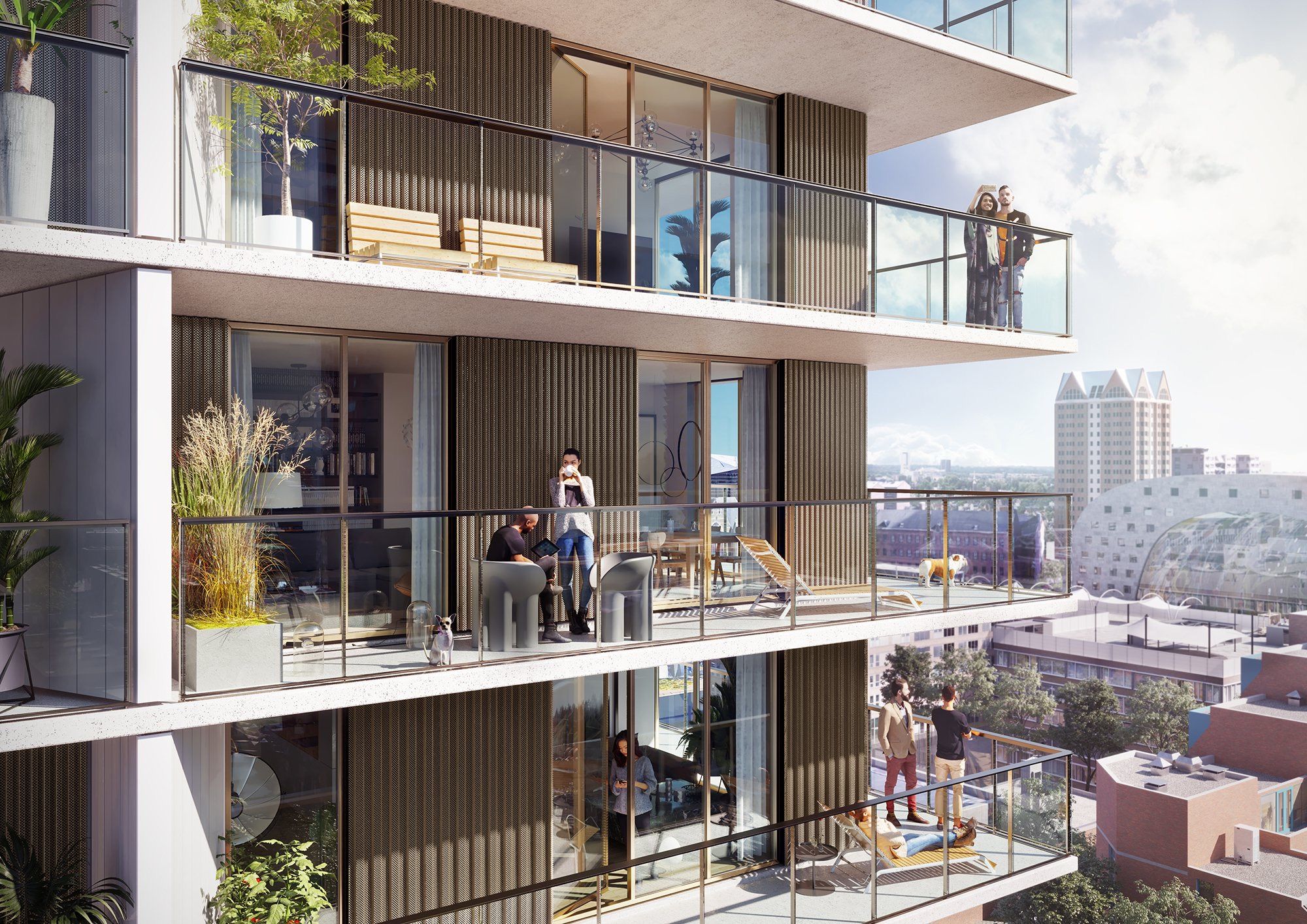 The ambition is to create a total concept with, in addition to the apartments, a city lounge where reading, meditation, informal meetings, co-working and catering are combined. These functions will be included, together with housing, in the so-called 'Rotterdam layer' of 4 floors. Above that, the high-rise towers up to 24 floors, over 70 m. Around the core, 13 apartments of various sizes are included per layer. Extending balconies run all around the building, creating depth in the facade. The facade design is inspired by a relief by Jan Schoonhoven, with staggered sloping planes in the depth of the balconies. This, and the design of the inner façade, avoids vertically continuous lines, and creates a lively image that will show even more diversity when occupied, like books in a bookcase. Also in the lower layers, the bookcase is - in this case literally - central from the entrance. Around it are the lounges, workplaces and the catering industry. An environmental plan (a collaboration between Laplab, the municipality and the design team) anchors the building in its surroundings and provides for greenery and the construction of (roof) terraces.