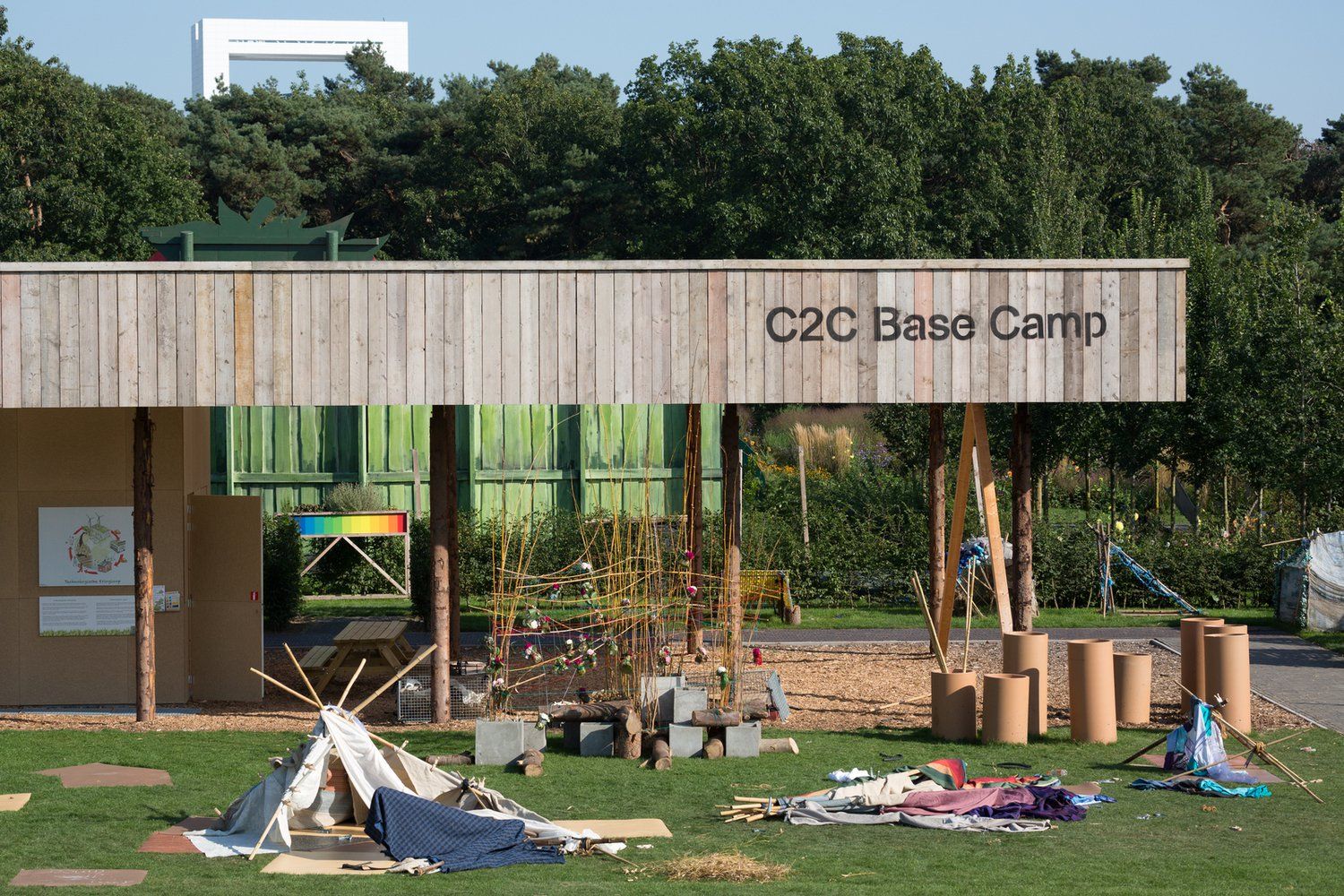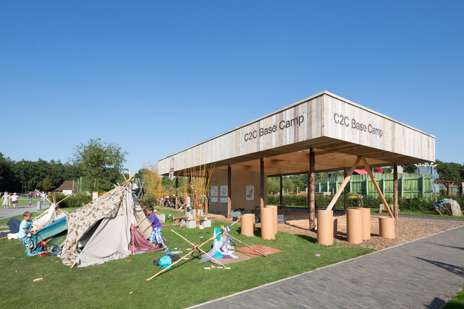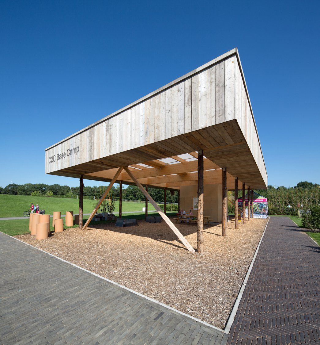 The C2C Base Camp is a temporary educational pavilion at the Floriade in Venlo, where children learn about sustainability and cradle to cradle. And wood is one of the main themes. By building huts, children are able to acquire real life knowledge about how to build with sustainable materials, how joints are made and what dismantle-friendly building actually means. The pavilion is a storage area and base camp, around which all activities take place – also in bad weather. The various life cycles of wood and wood recycling are given an appropriate place in the pavilion and the relationship between them is highlighted. The pavilion demonstrates the wide range of uses for wood and clearly explains the meaning of sustainable design and material use during the course of educational programme.