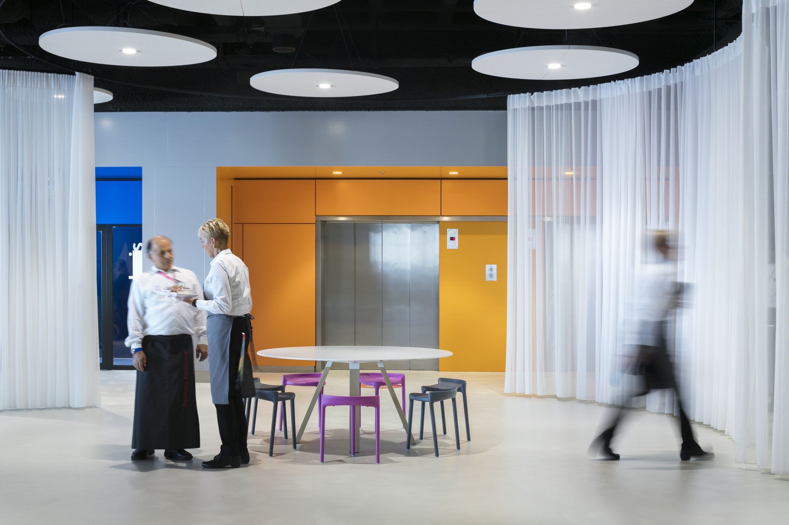 The wall also consist of a water supply wardrobe and paper , but also switches, locks and gadgets like a rotating clock, that appears in special circumstances. The hollow space is multi functional as it isolates sound, hides heavy columns and can be used for various purposes.The central square, the MeetUp Plaza, offers a cozy atmosphere for meetings of every type.There are various, colored niches that offer a nice meeting point for everyone. A 87-meter lang curtain divides gently the area into smaller ones. In this way, also more confidential or private gatherings can take place.