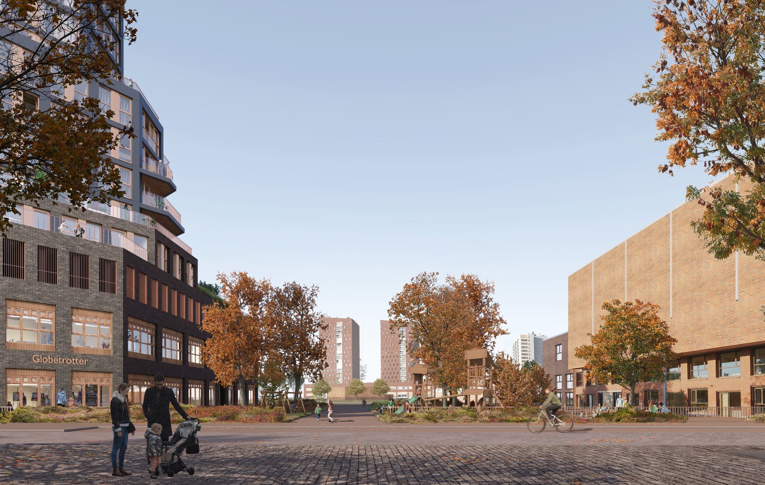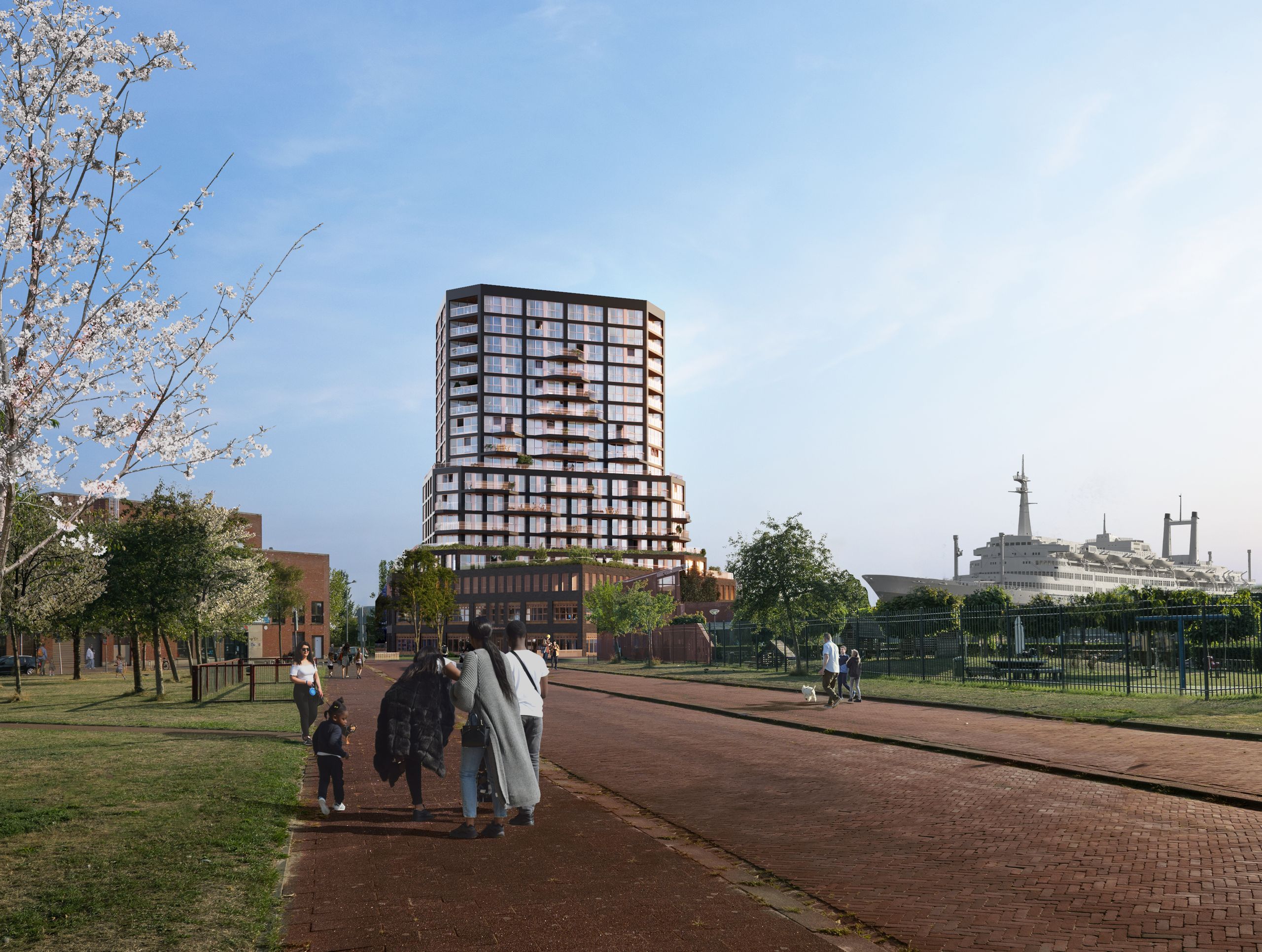 We show that a tall building can have a valuable, active and socially relevant plinth. The building occupies a crucial place for the neighborhood, which is why there is a social program around it. Parking is eliminated. The mix of residents will soon have everything at hand; shared transportation, a shared kitchen and roof terrace. The school and coffeebar and daycar are on the first floor. Above the residents will enjoy fantastic views and generous outdoor space.