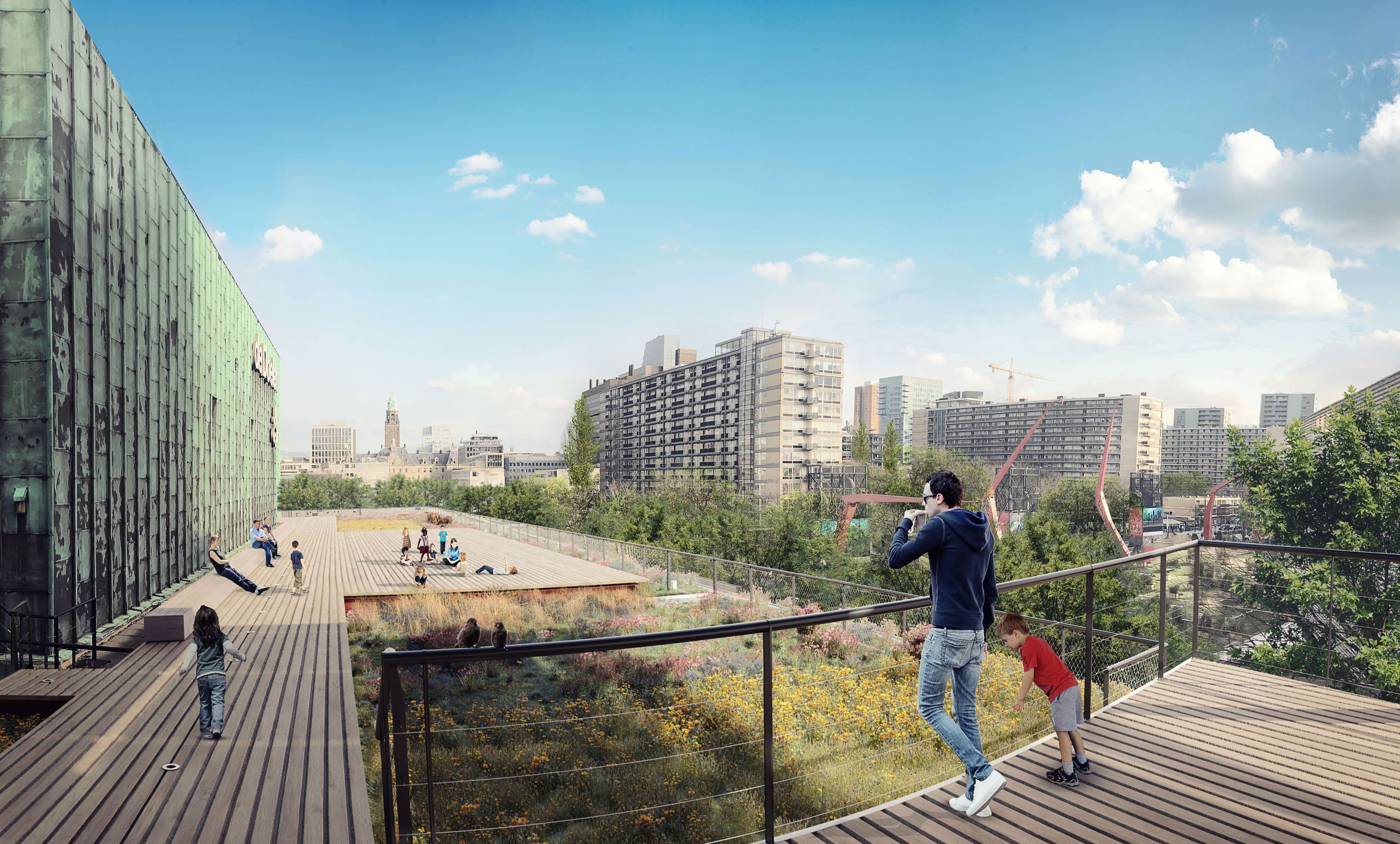 Concert and congress building De Doelen will be the first to be equipped with a green and blue roof. It will also be possible to organize small events on a stage on the roof at the Schouwburgplein, in the greenery and with a view of the city. The background decor is formed by the beautiful copper and monumental roof structure of the main hall.
