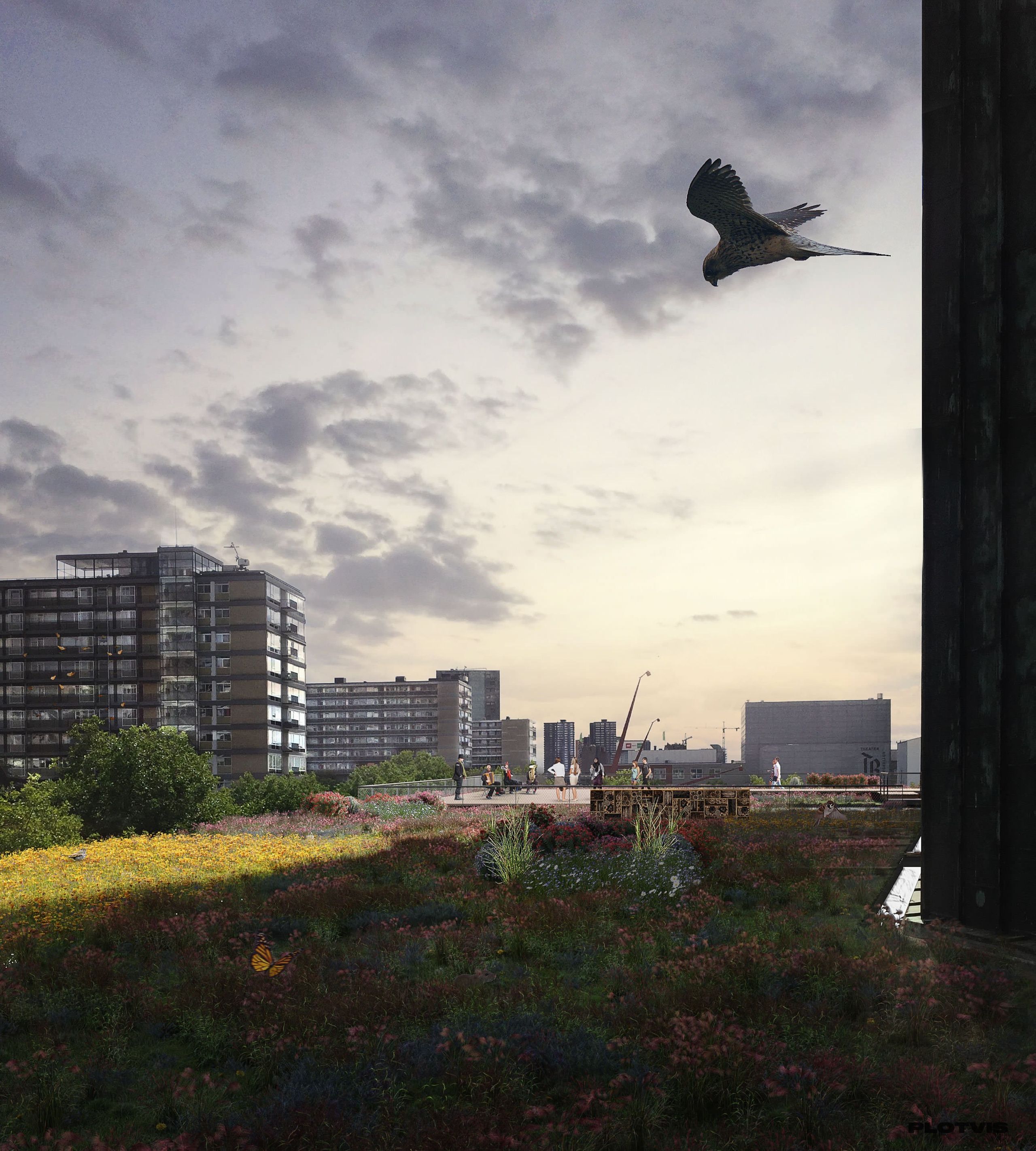 The green and blue roof buffers water in crates under the greenery, thus contributing to the prevention of flooding. The stored water feeds the plants and, with the greenery, contributes to cooling the building. The entire roof combats heat stress and thus contributes to greening the city, purifying the air and storing CO2. The lushly designed green roof landscape is designed in a geometric pattern that matches the orthogonal layout of the Concertgebouw.