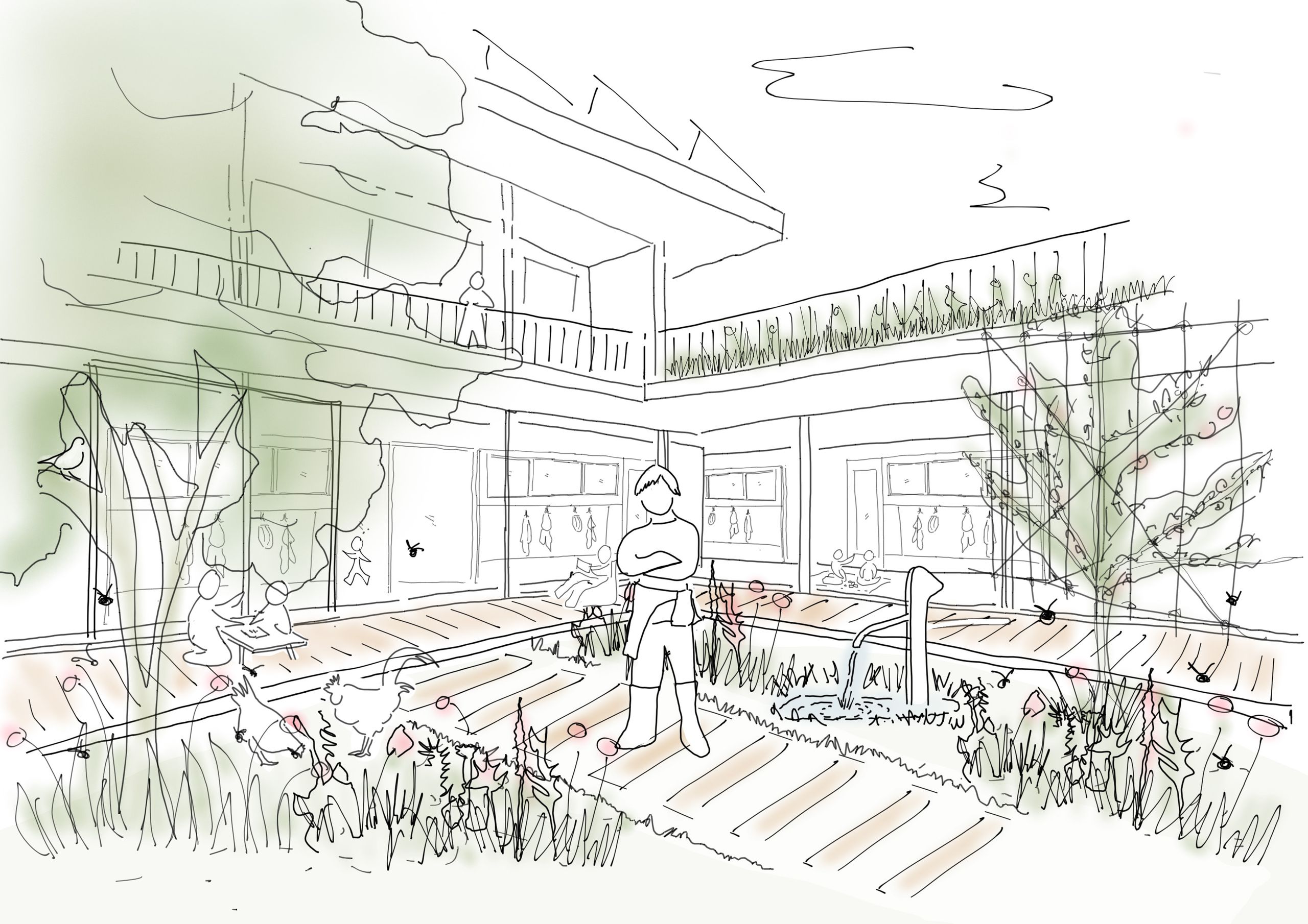 The green patio is an oasis of light and tranquillity. Children learn, play or find their own spot in a hammock or wigwam. Each season brings new experiences: lunch in the winter sun, fruit picking in autumn, tending a rooftop vegetable garden in spring. Inside and outside merge, and nature becomes an extension of the classroom.