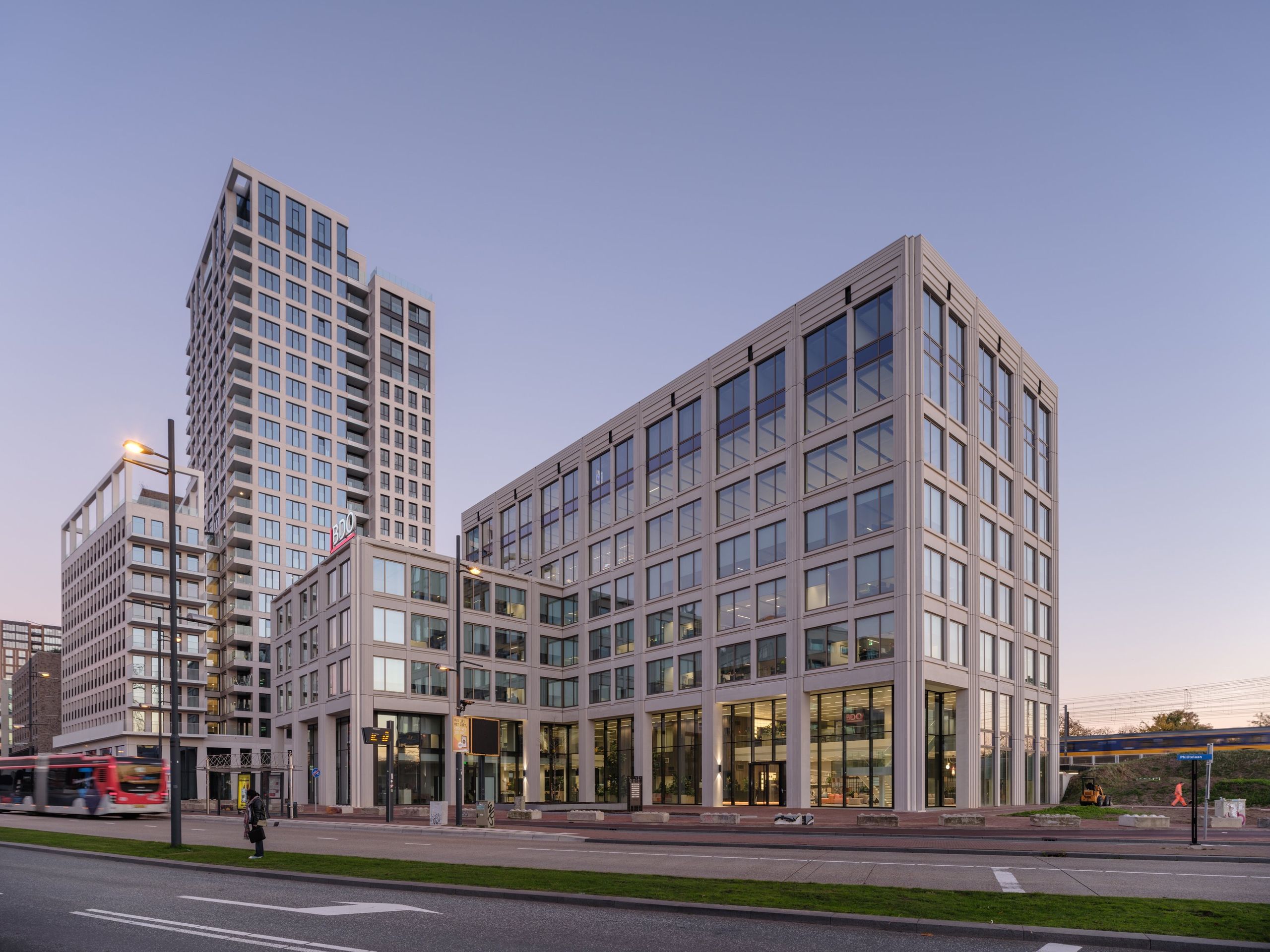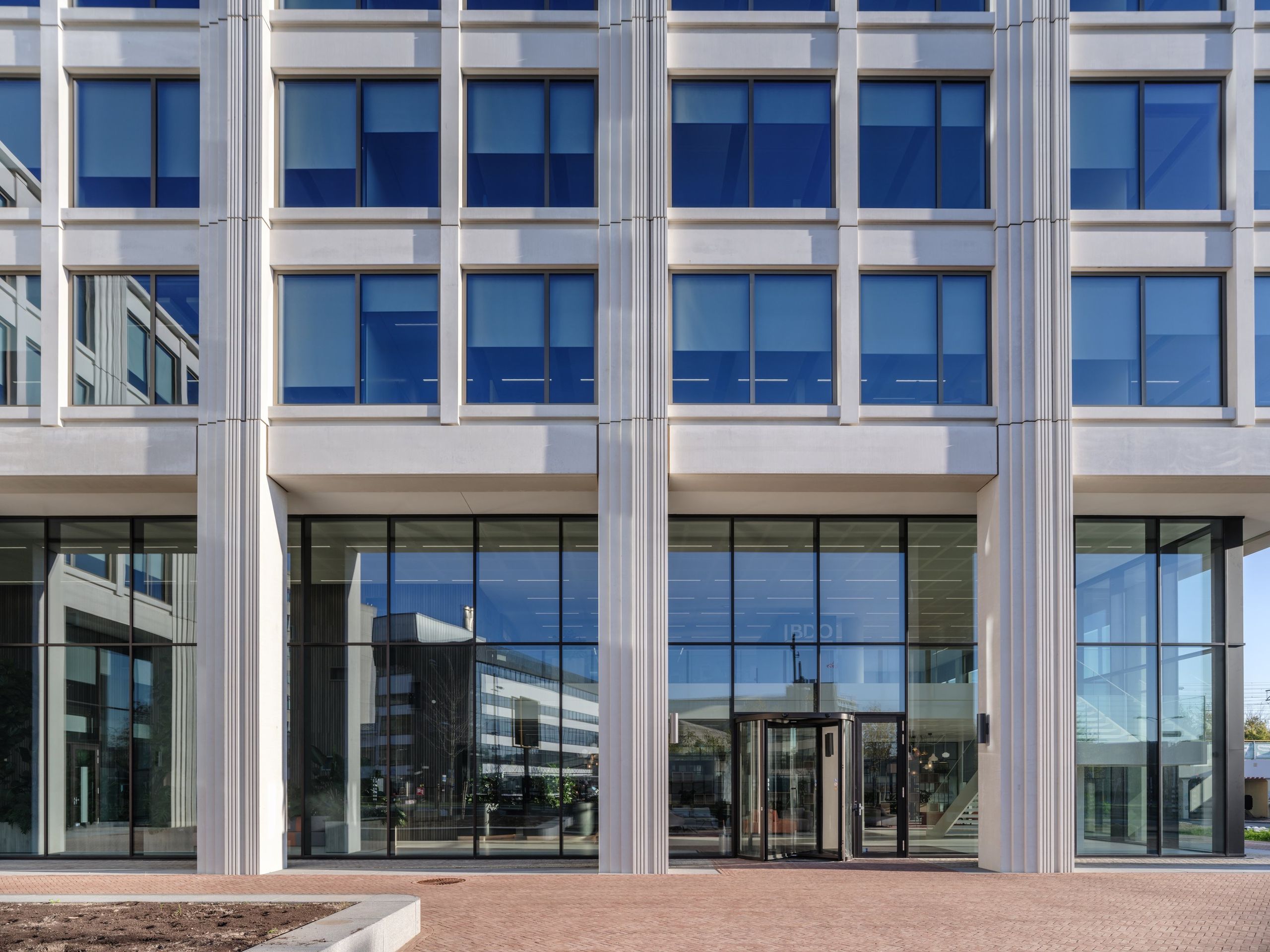 Double the height of the colonnade, the inside is shaped like a vide and continues in the high rise. This creates a royal entrance hall with a view of the first floor. The first floor of the low rise intersects this vide makes the mark in which the two volumes meet. The subtle differences between the two volumes are further reflected in the differing ending of the façade on the upper layer.