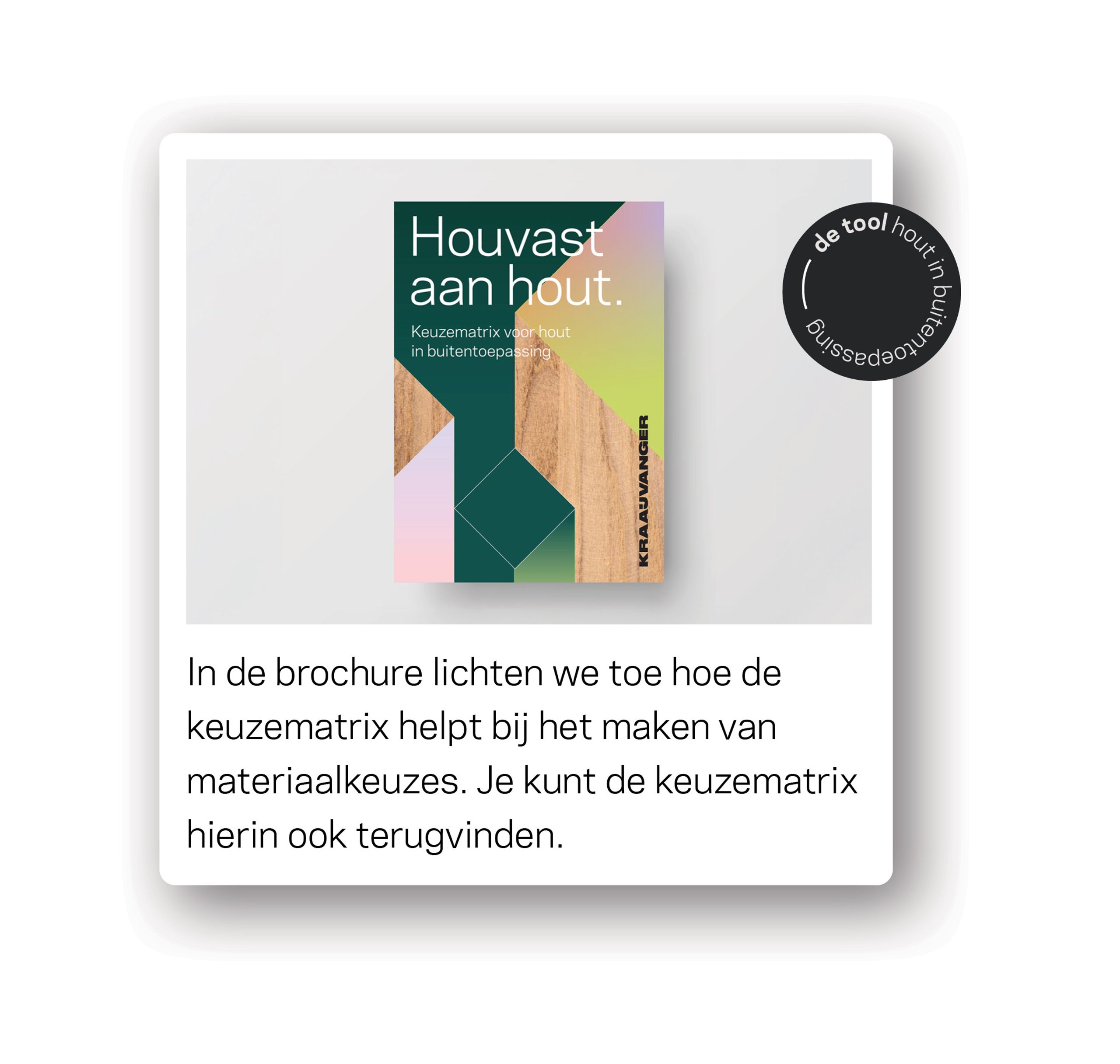 Om hierin houvast te bieden ontwikkelden wij de Keuzematrix voor hout in buitentoepassing. Deze matrix helpt architecten en bouwprofessionals om al in een vroeg stadium de juiste keuzes te maken. Niet op gevoel, maar op basis van inzicht in materiaalgedrag, prestaties en milieu-impact.