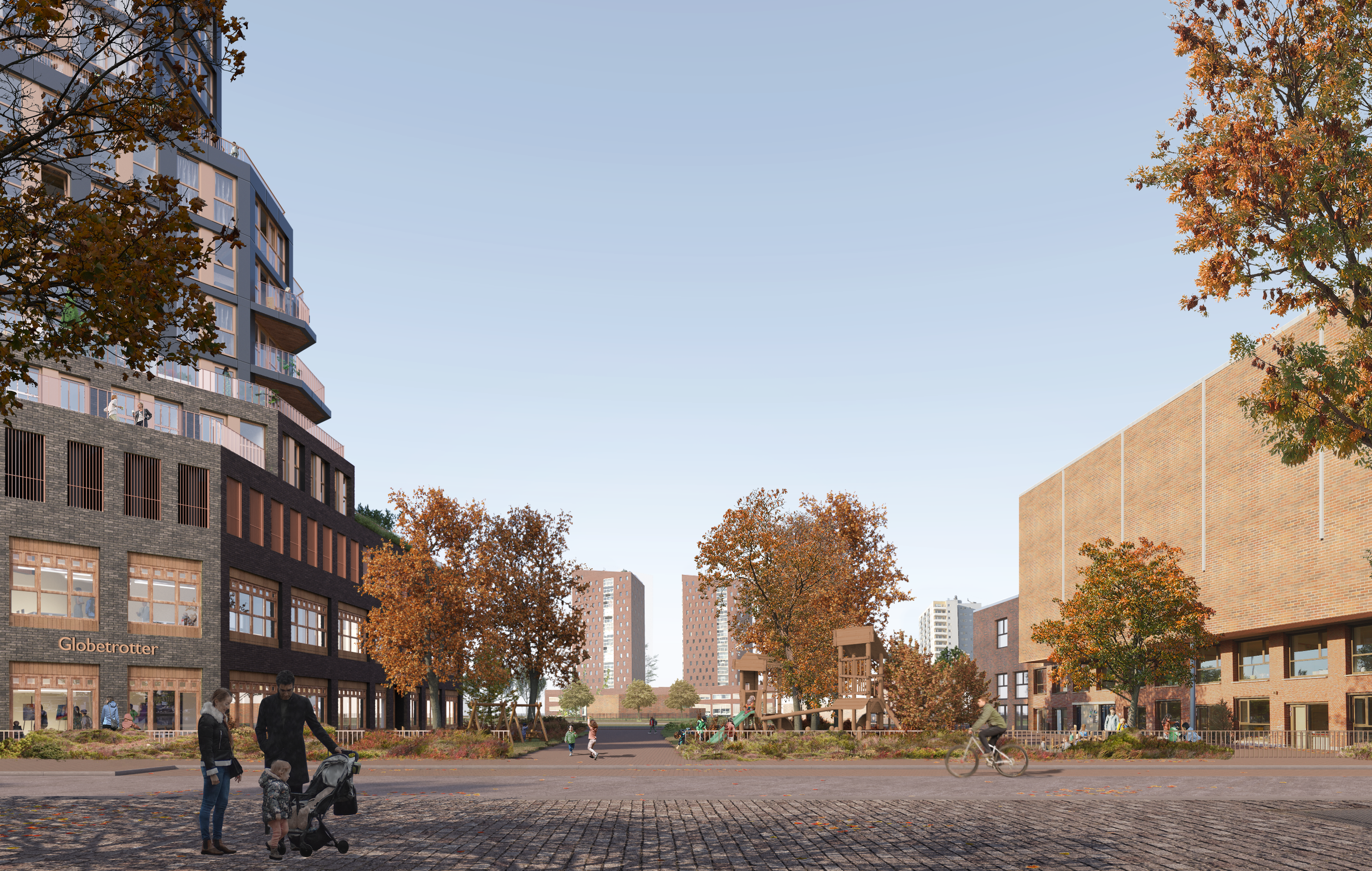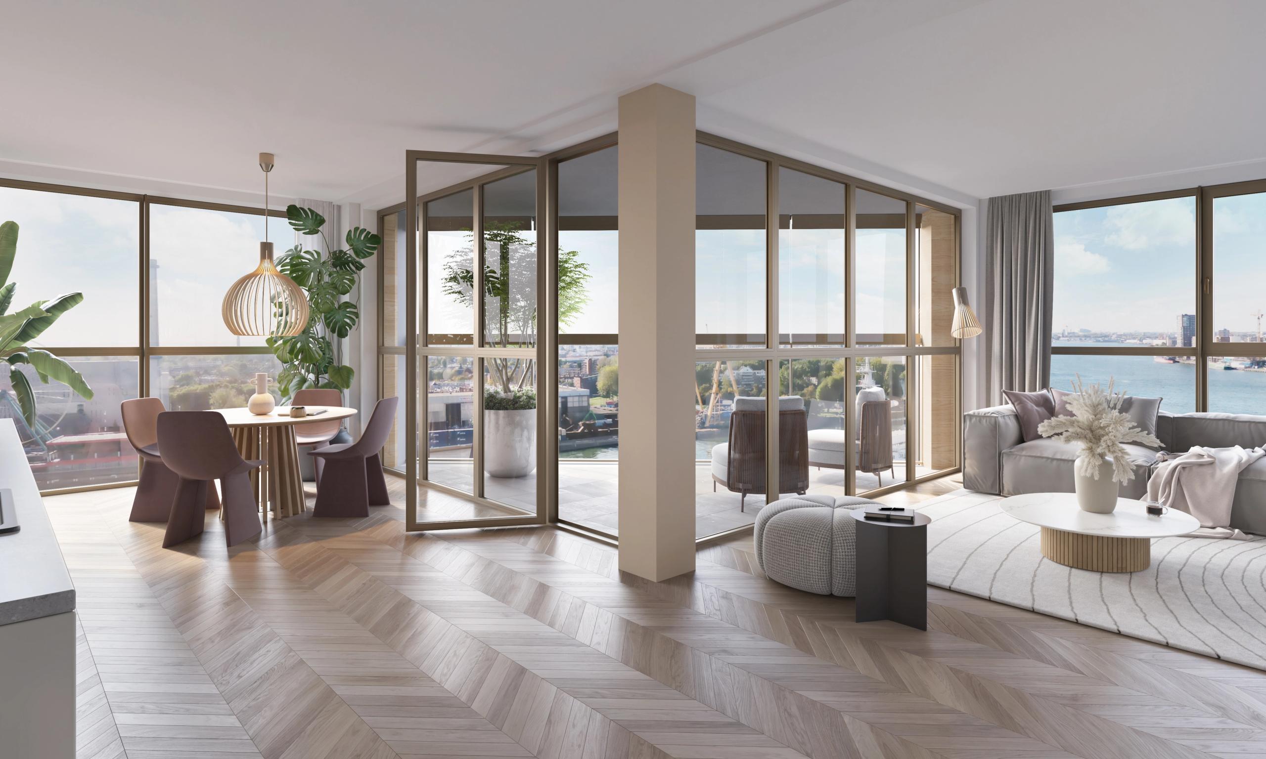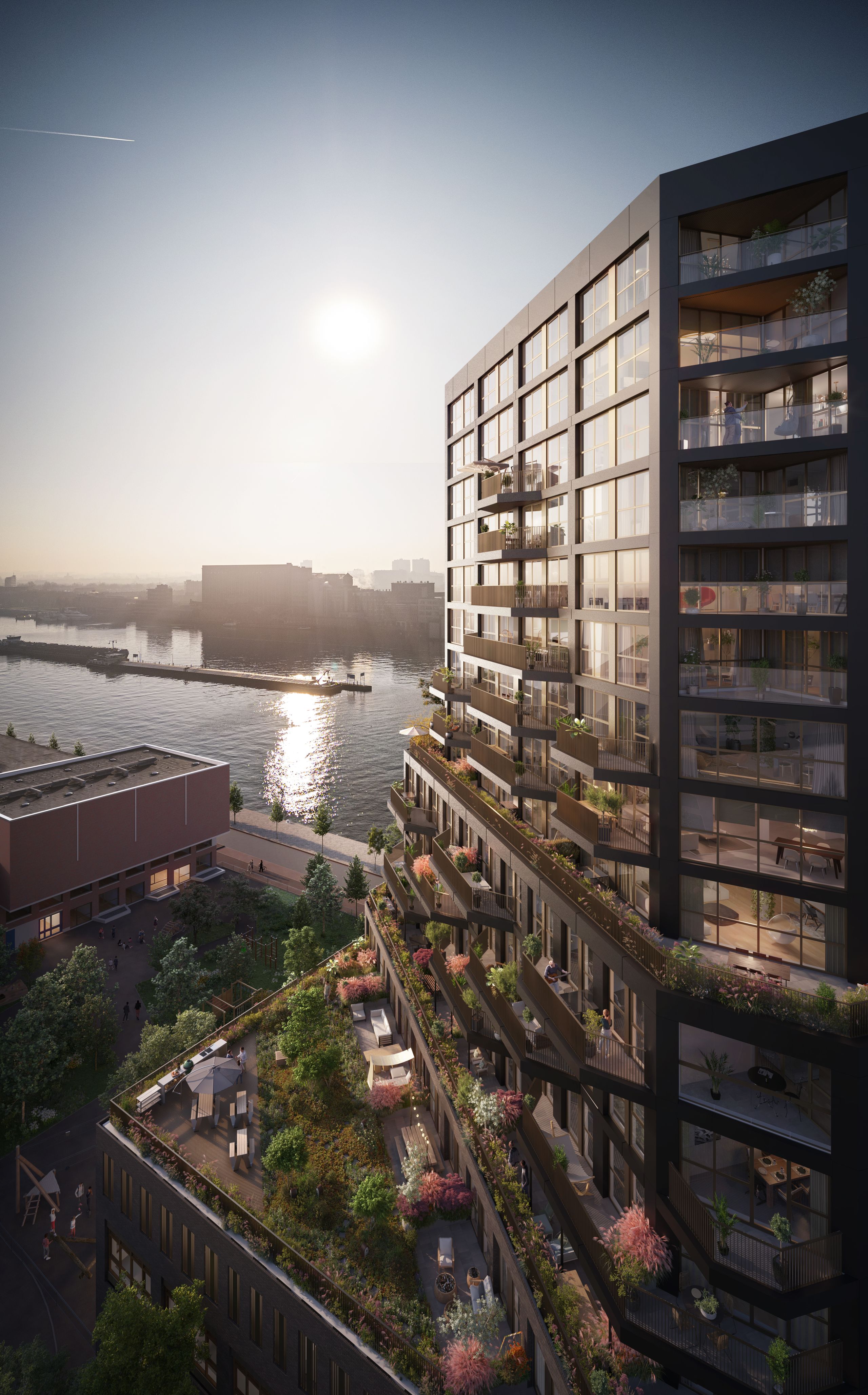 De Scharnier wordt een echte ‘sociale blender’ waar wonen, leren en ontmoeten samenkomen. Het gebouw biedt plek aan een basisschool, BSO, kinderopvang en een buurtgerichte horecavoorziening. Kinderen spelen op het groene schoolplein en bewoners ontmoeten elkaar op daktuinen, wintertuinen en terrassen. De woningmix is inclusief: van compact tot royaal, met een speciaal segment voor middenkoop om doorgroeien binnen de wijk voor Katendrechters mogelijk te maken.