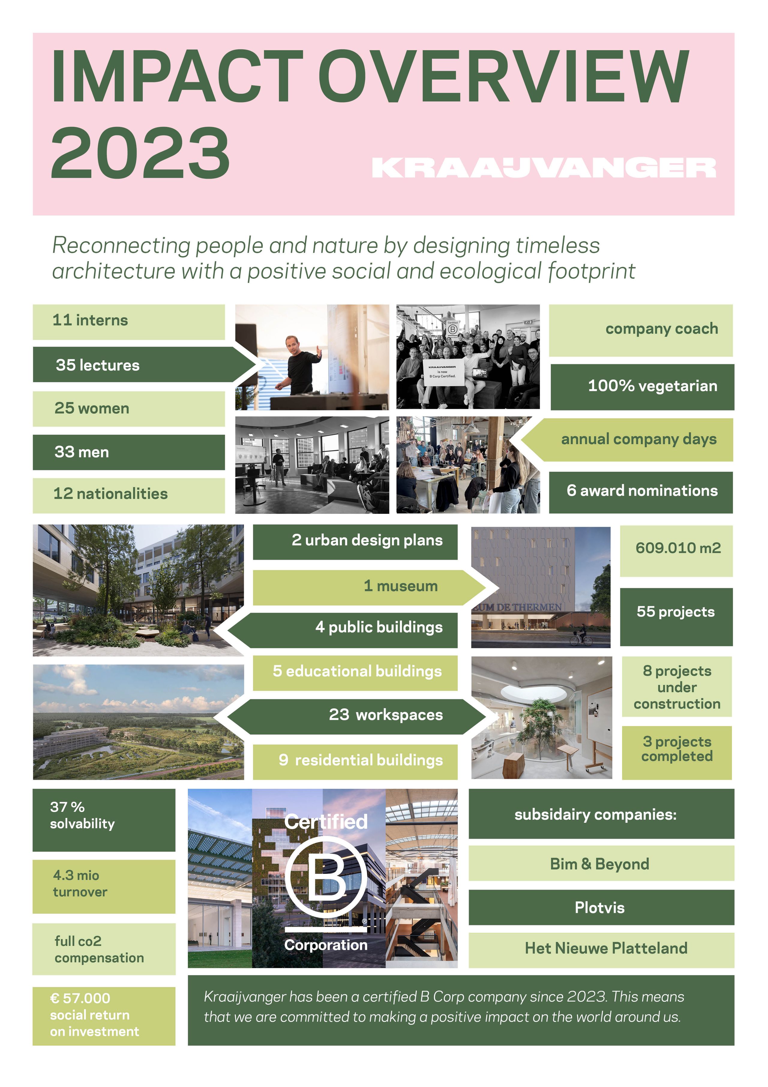 Dit report geeft een overzichtelijke kijk op de impact die we in 2023 hebben kunnen maken. Niet alleen met onze projecten, maar ook met hoe wij als bedrijf omgaan met onze medewerkers, diversiteit, persoonlijke groei, social return en onze eigen footprint.