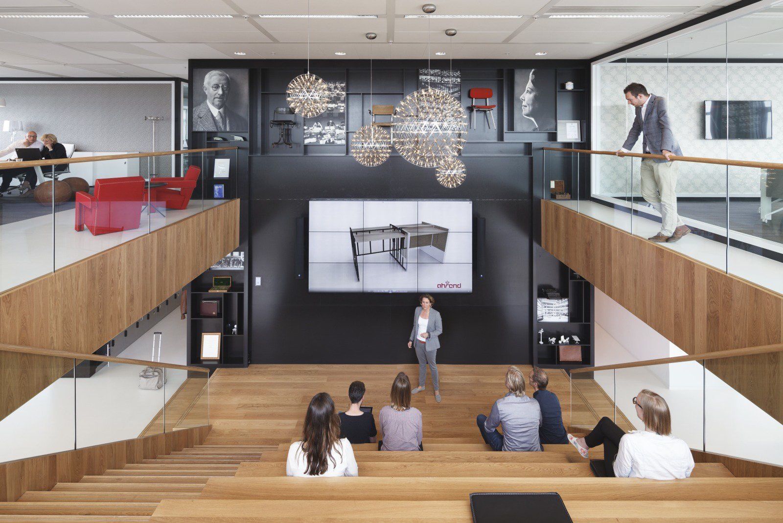 Terug bij de kop van de ruimte voert een grote met hout beklede tribunetrap naar de volgende etage, waar een aantal projectruimtes zijn gewijd aan de ontmoetingsfuncties binnen een kantoor, zoals vergader- en projectruimtes, een video conference room en een directiekamer. De spectaculaire trap met uitzicht op een grote videowand is tegelijk een event space waar presentaties kunnen worden gegeven aan een publiek van ongeveer honderd mensen.