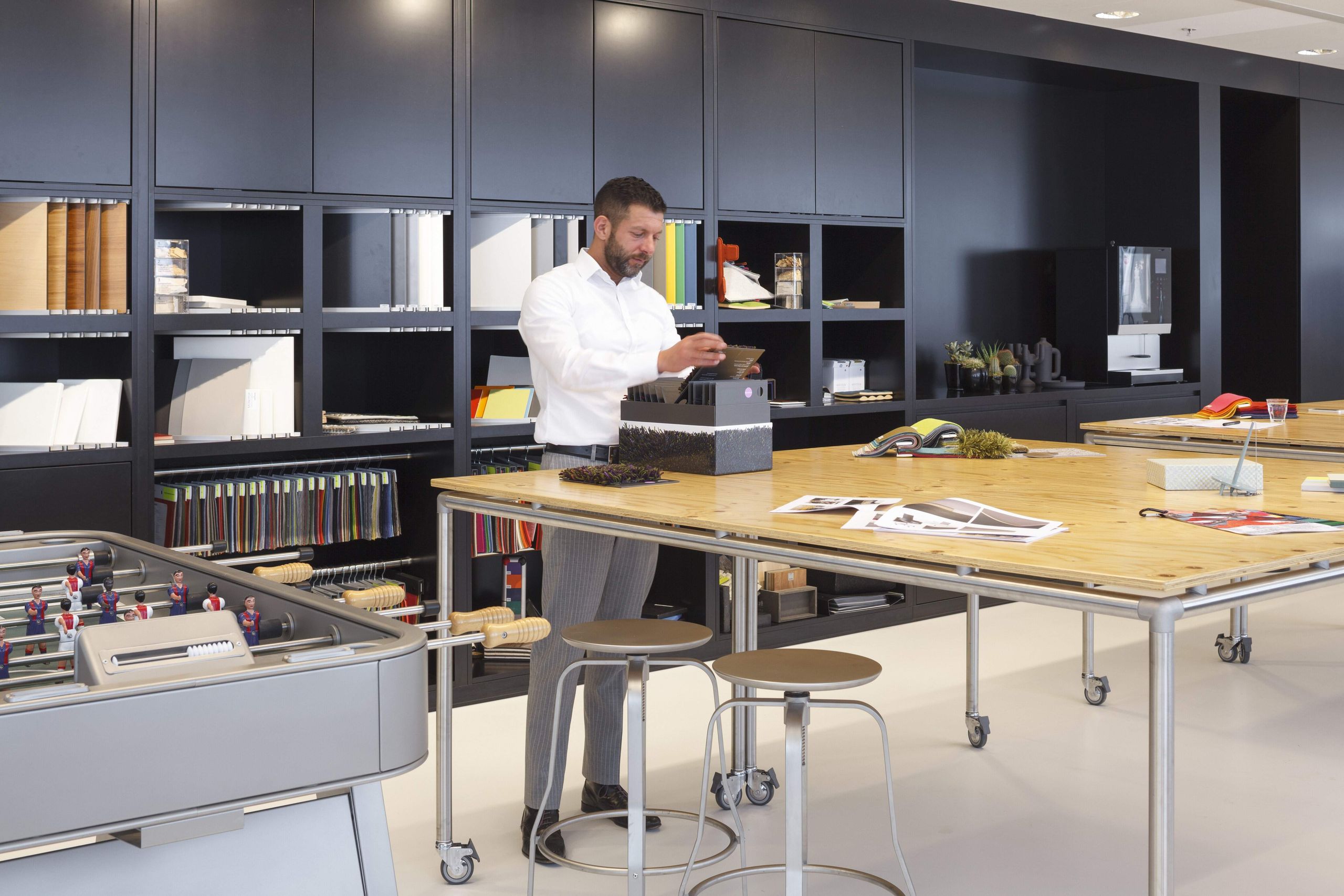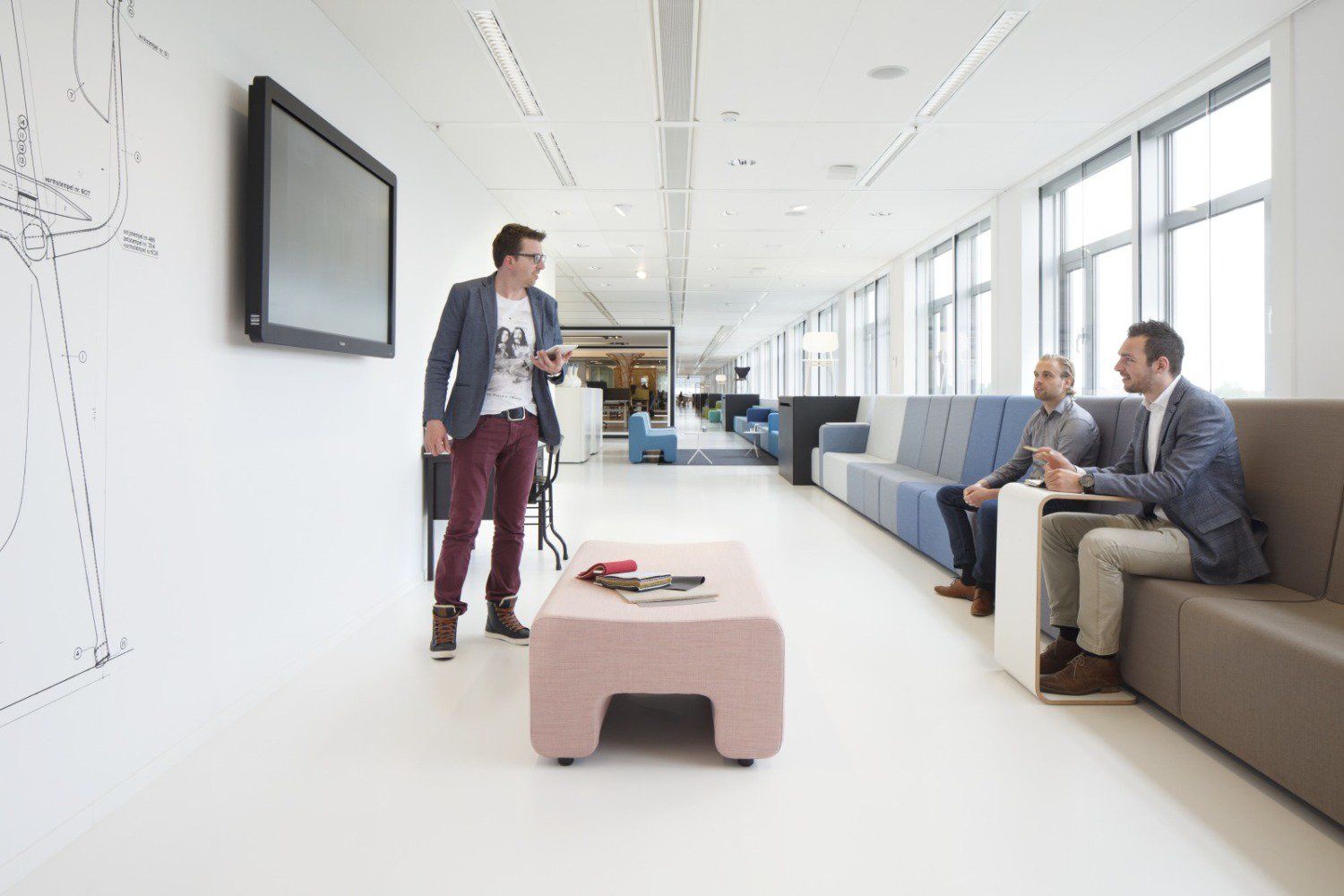 Wanneer bezoekers de showroom inlopen, stappen zij in een zichtlijn over de volle honderd meter van het gebouw. Om deze ruimtelijkheid te krijgen zijn alle tussenwanden van het bestaande gebouw weggehaald. Langs de buitenwand is dat geaccentueerd met een bank over de volledige lengte; honderd meter soft seating als overleg- en breakout ruimte.