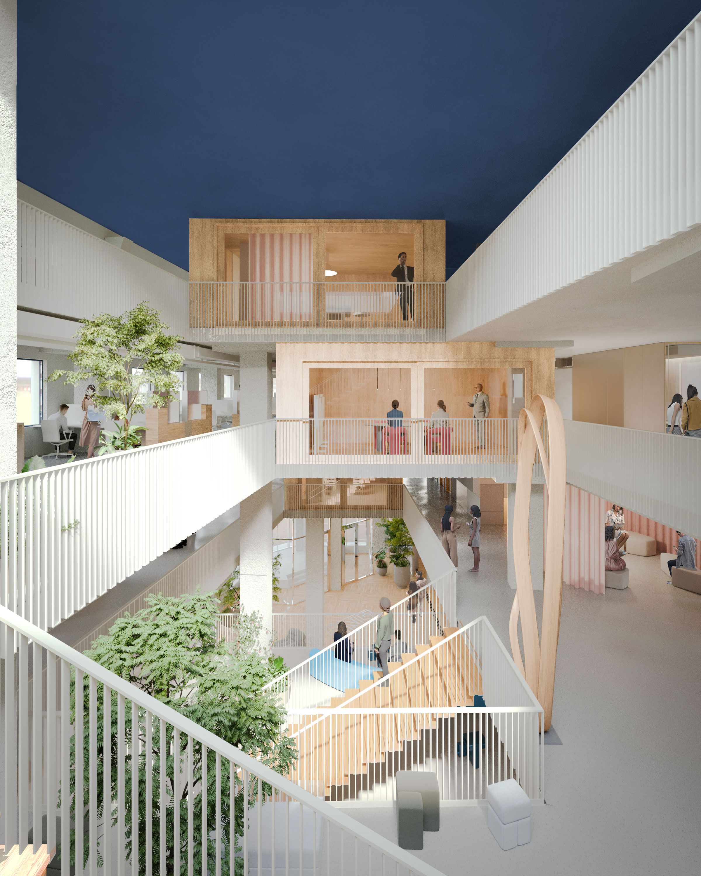 elkaar verbonden. Door vloervelden weg te snijden ontstaat een ruimtelijke infrastructuur die lucht, uitzicht en ontmoeting mogelijk maakt. Natuur en buitenruimte krijgen een plek in het interieur. Gebruikers voelen de dag,