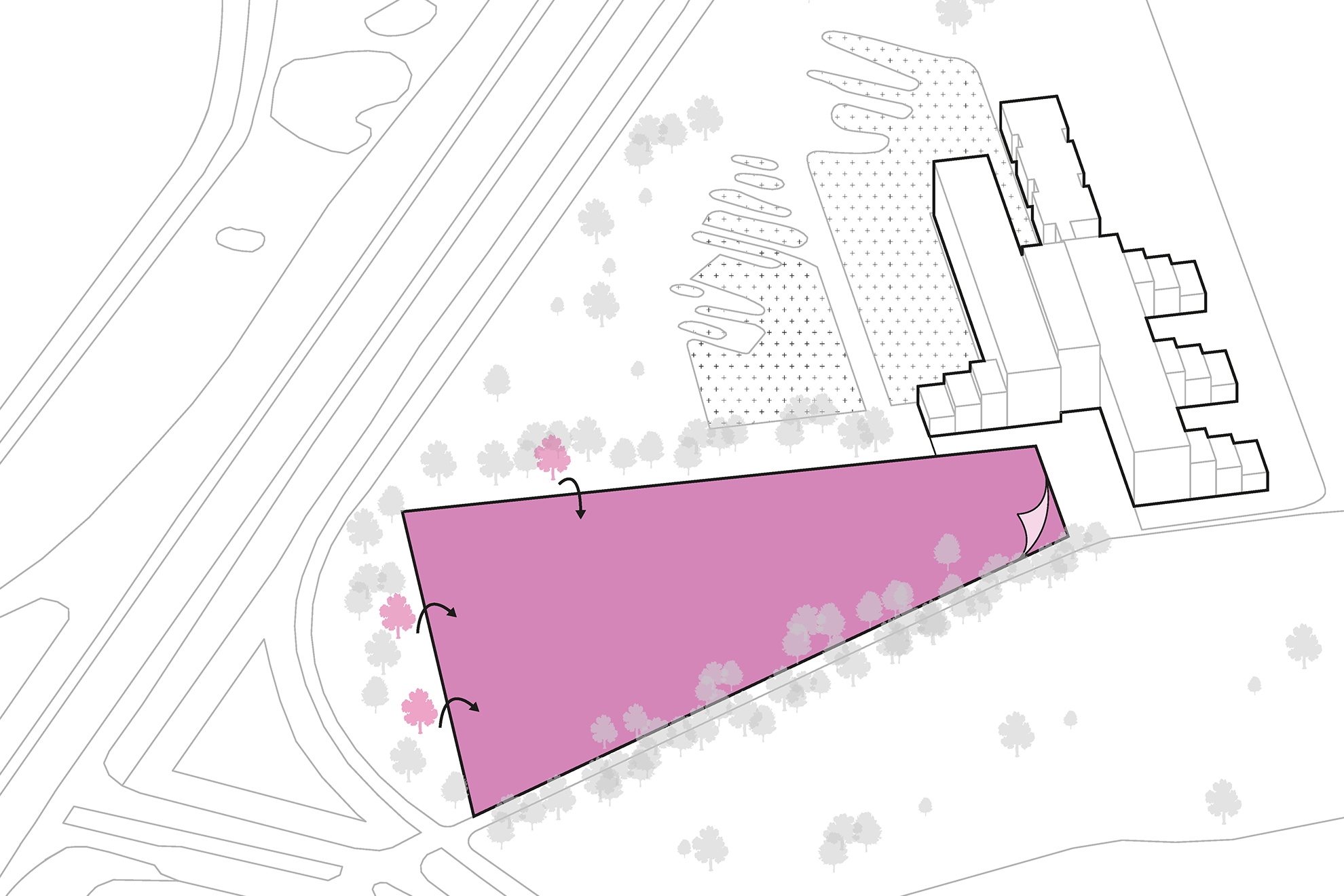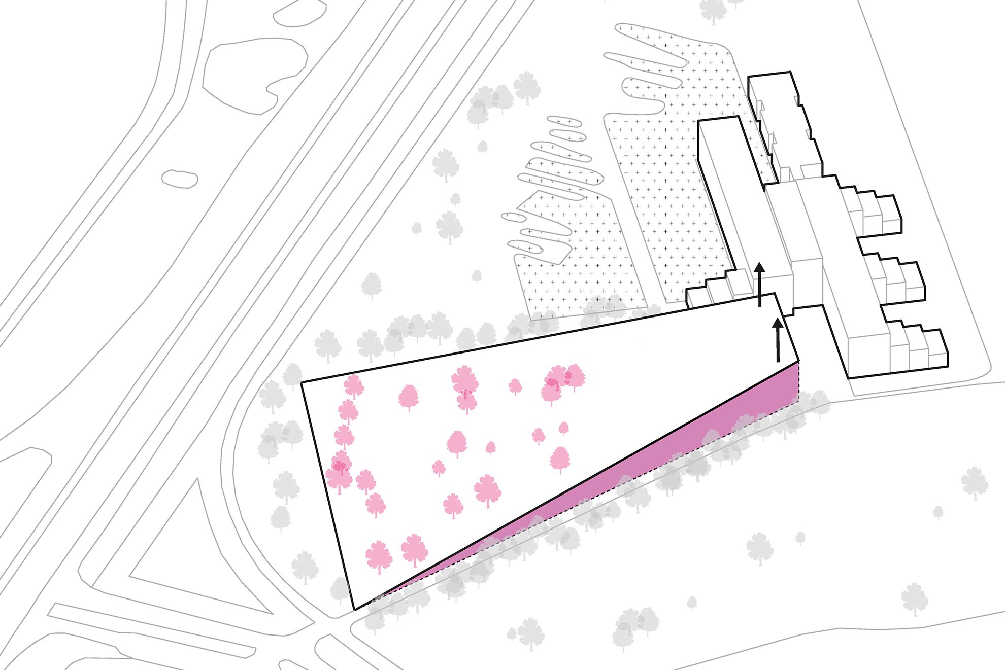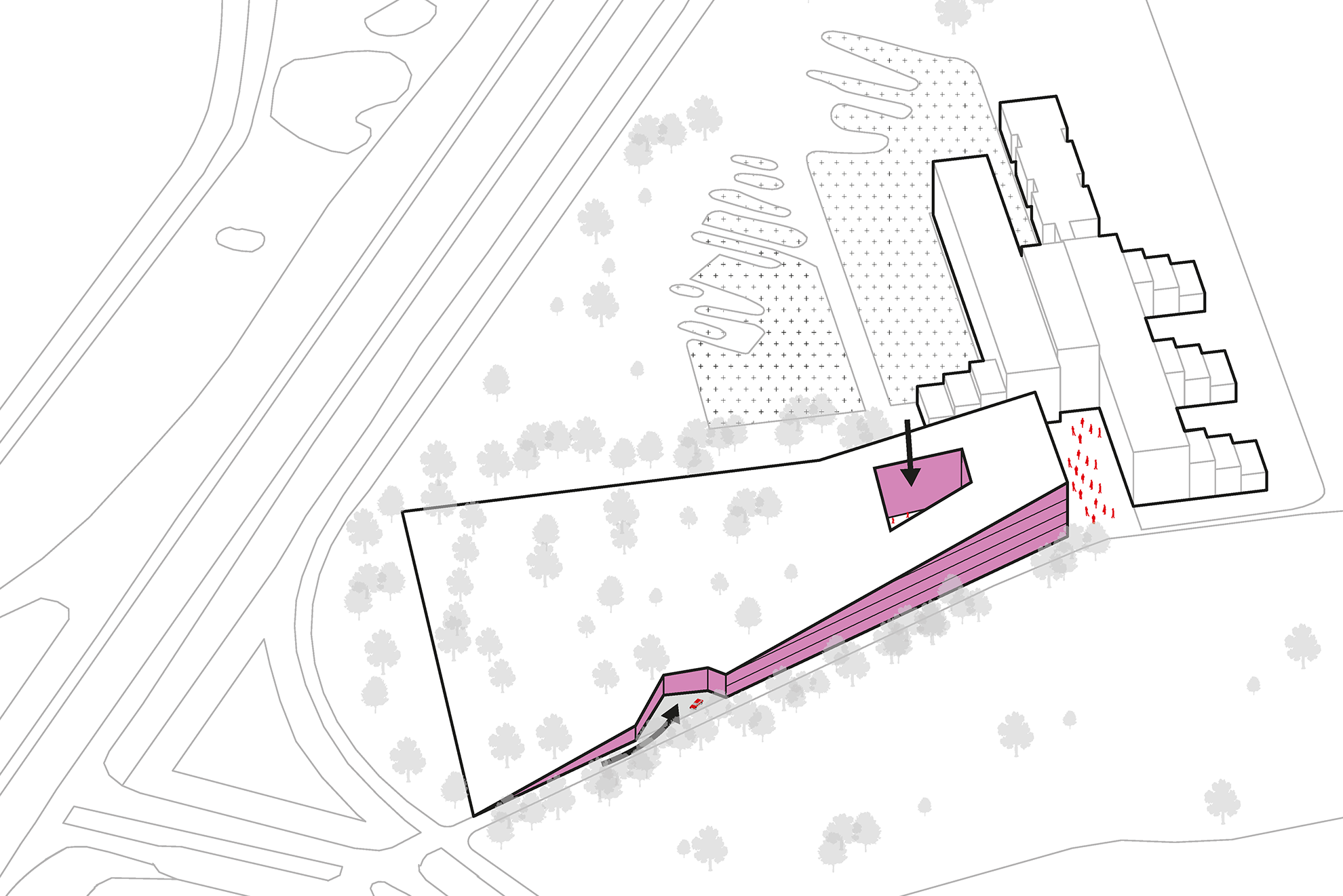 Het creëren van meer ruimte en het wegwerken van een massale parkeerplaats is een bijzondere maar interessante uitdaging. Om het ontwerp feilloos te integreren met het omringende landschap is er voor gekozen om als het ware de grond onder de parkeerplaats op te tillen en daaronder de auto's te verbergen. Naast het feit dat er onder deze helling ruimte is voor meer parkeerplekken en kantoren, biedt het meteen verschillende voordelen zoals fijnstofreductie (NOx en SOx) en het tegengaan van hittestress.