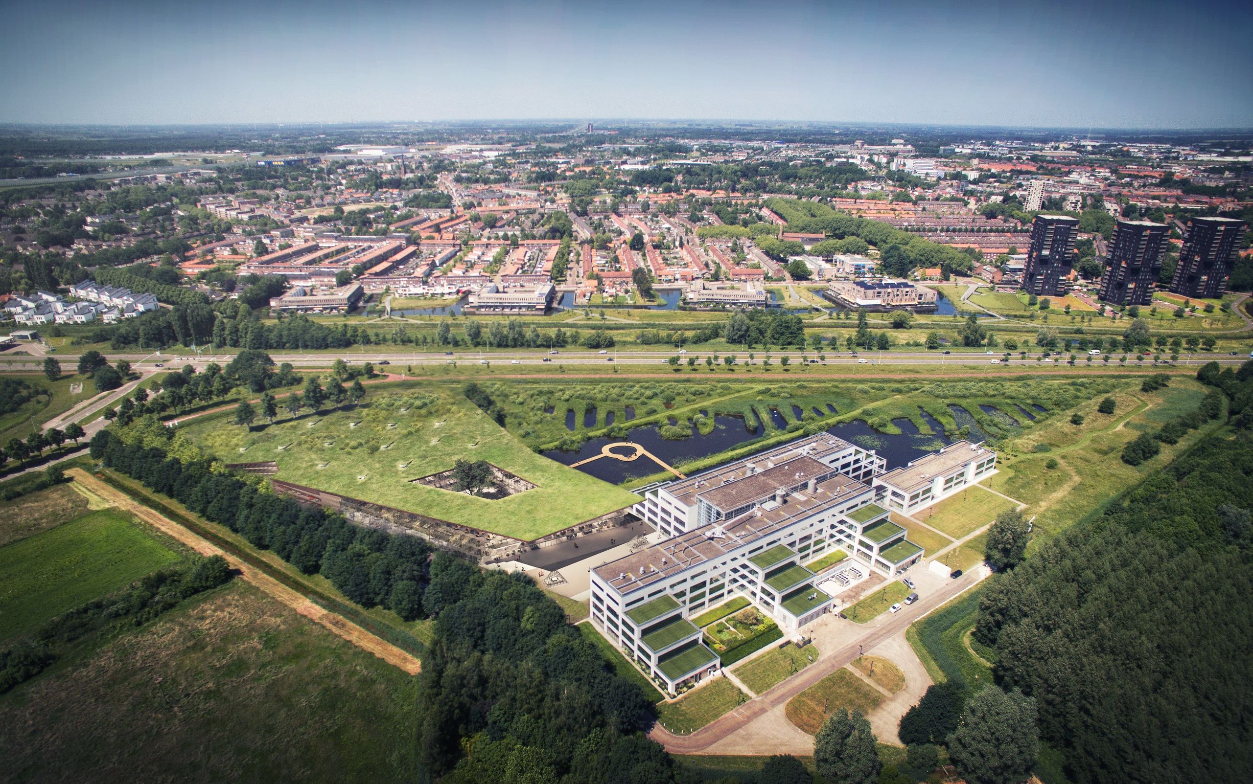 Alleen het optillen van de omgeving en daarmee het creëren van meer ruimte is niet wat de omgeving groener en milieuvriendelijker maakt. Op de helling wordt niet zomaar een gazon aangelegd maar een heuse leeflaag. Planten en bomen moeten onderdeel uitmaken van de helling zodat de natuur er goed kan gedijen. Onder de helling komt een parkeergarage voor 750 auto’s (tegenover 600 nu) en een kantoorgebouw van vier lagen. Dit gebouw sluit aan op het bestaande gebouw. In het kantoordeel komt een vide met een dakraam, zodat er daglicht binnenvalt.