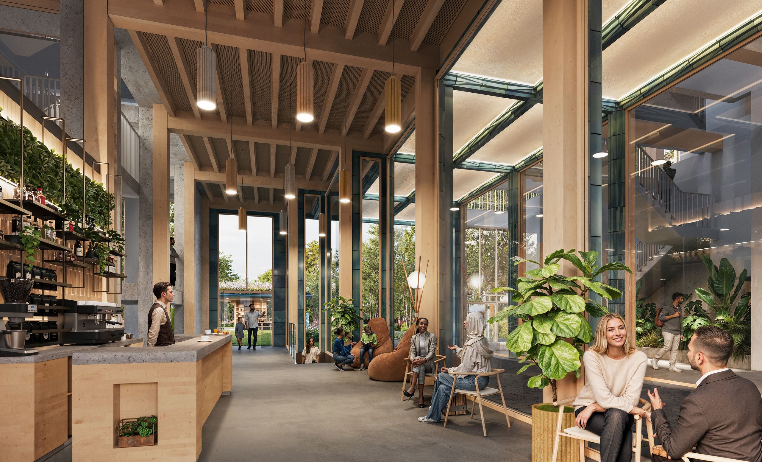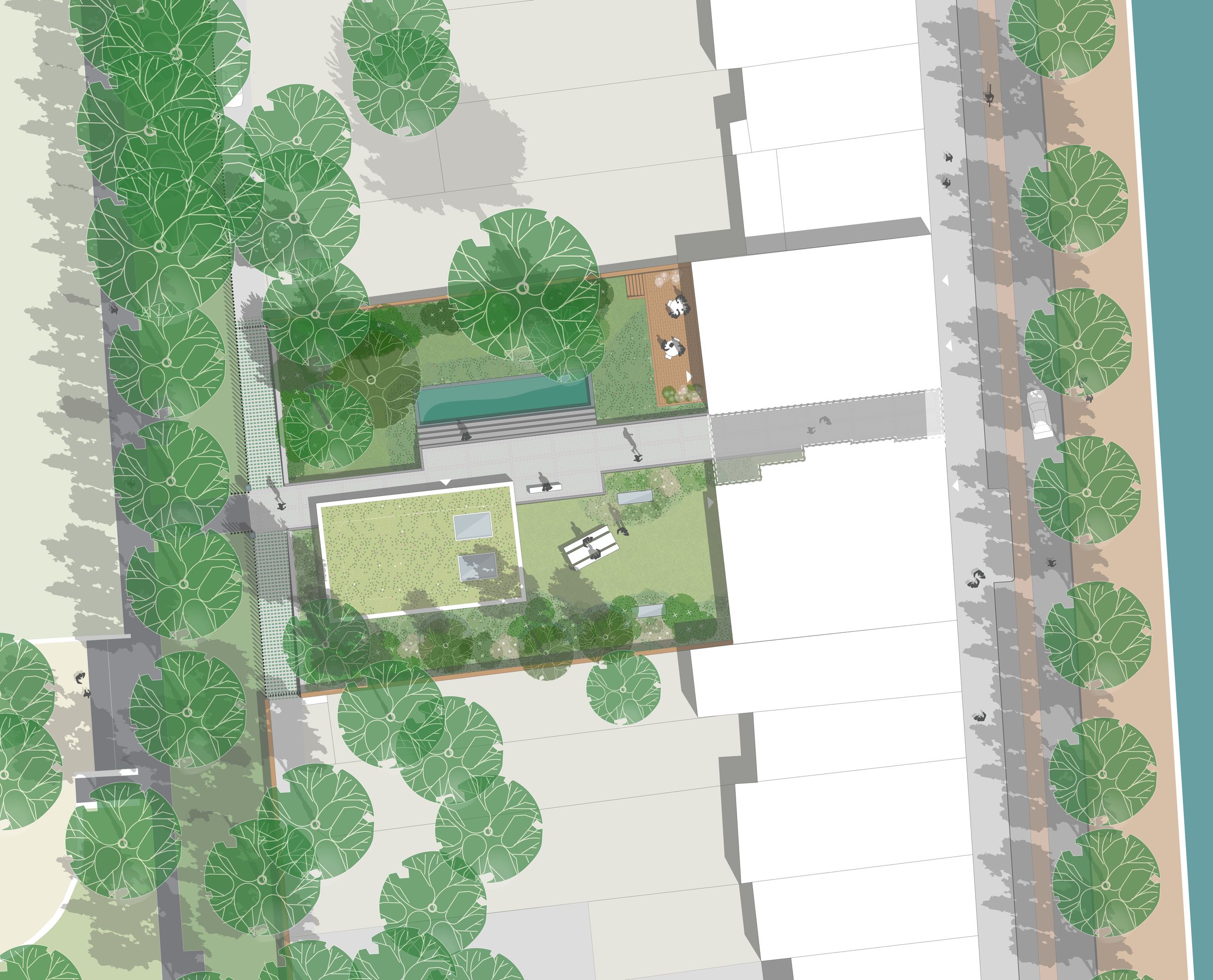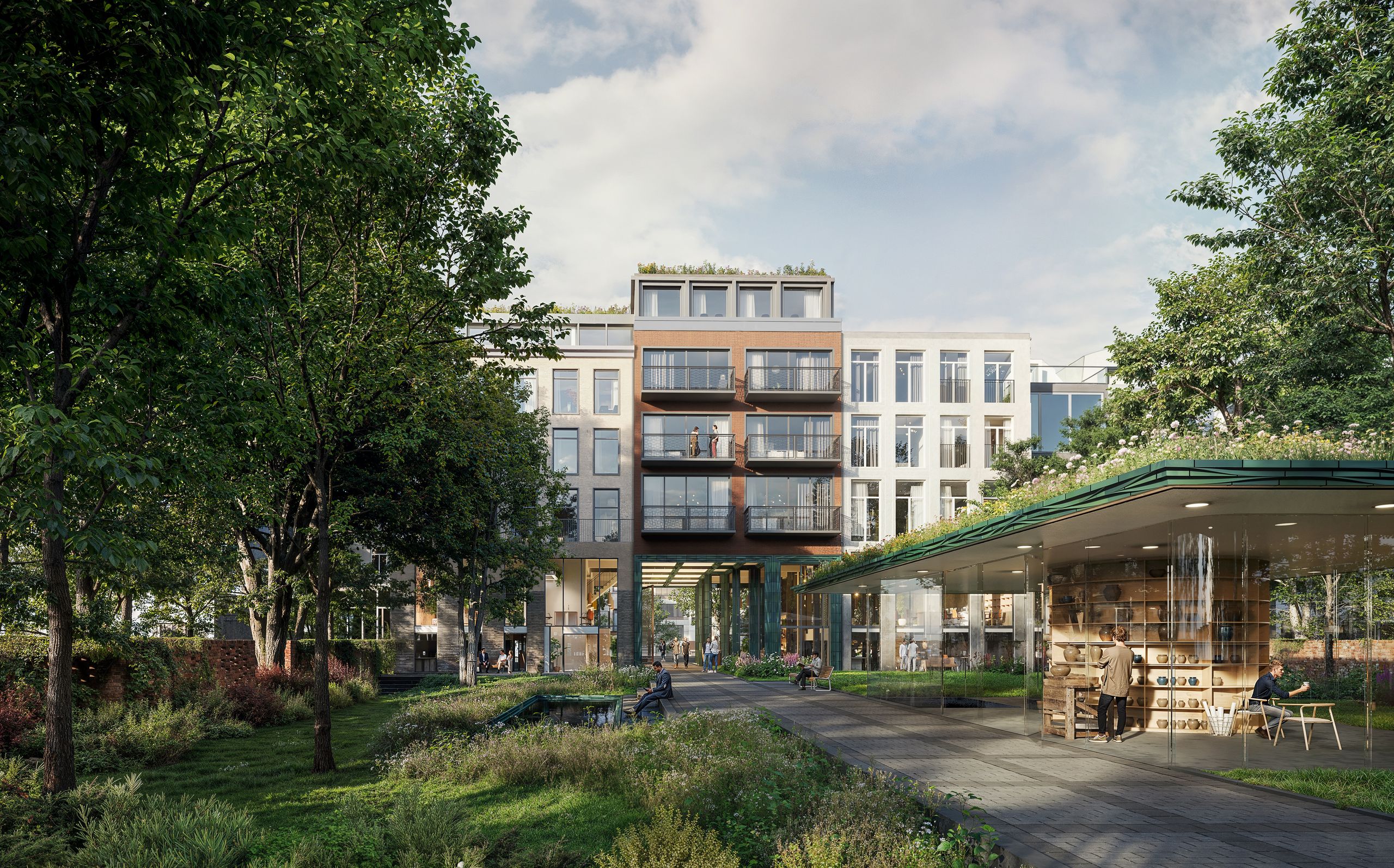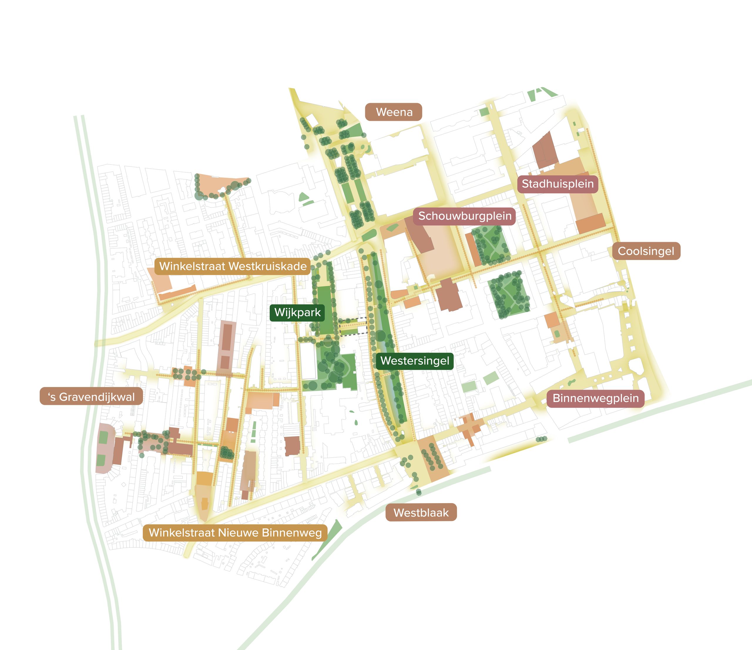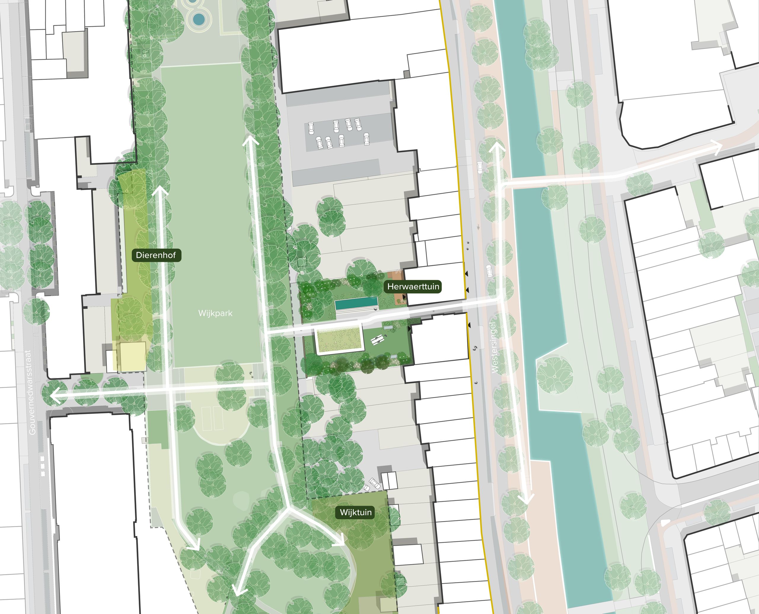 In en rond de centraal gepositioneerde passage komt alles samen. De groene zichtlijn die de Westersingel verbindt met de Herwaerttuin en het Wijkpark. Grote raampartijen maken van de doorgang een levendige ontmoetingsplek, waar wonen, werken en ontspannen naadloos in elkaar overlopen. Grote keramische kaders omlijsten de doorgang en bieden zicht op de huiskamer met daghoreca, de woon-/werkentree en de groene doorsteek naar de tuin en het Wijkpark.