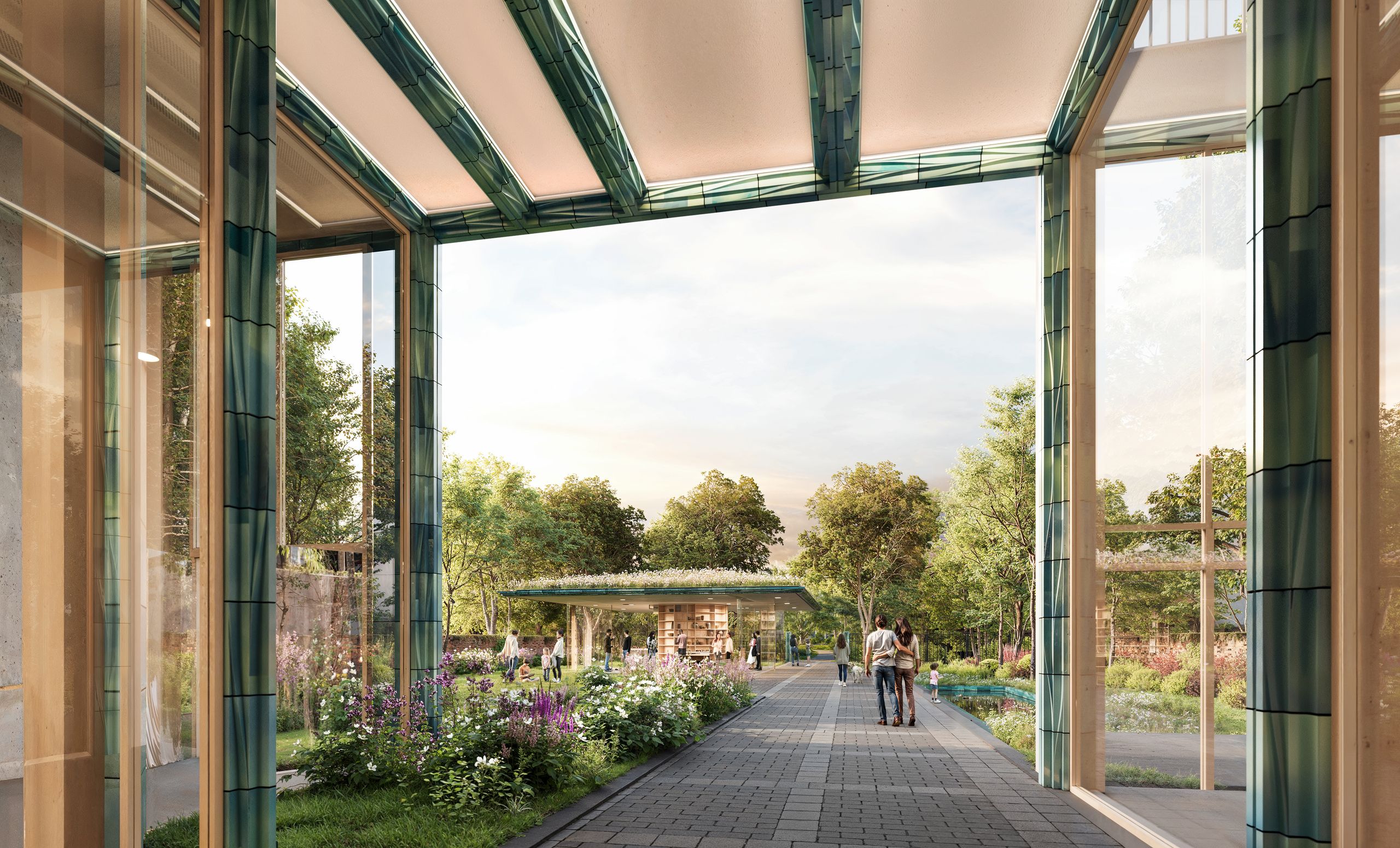 Dankzij haar aangename afmetingen en open vorm voelt de passage licht en ruim aan. Transparante wanden zorgen voor sociale interactie en veiligheid, terwijl circulaire 3D-geprinte keramische tegels met water- en natuurmotieven een speelse verbinding leggen tussen stad en park.