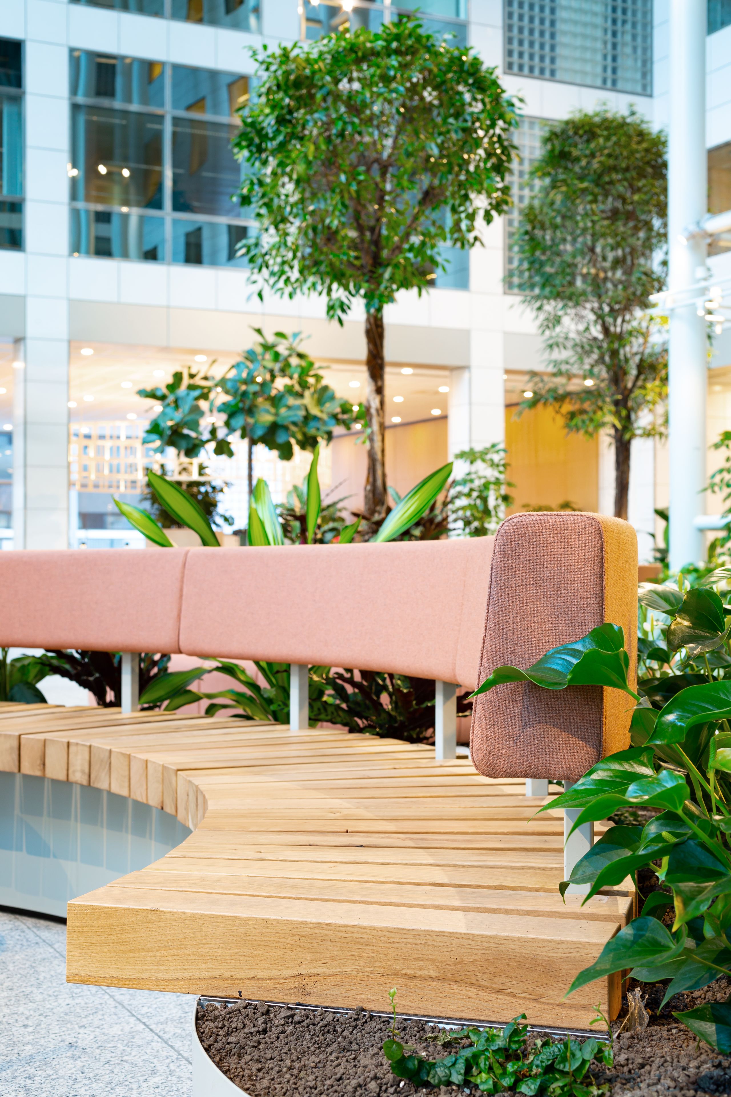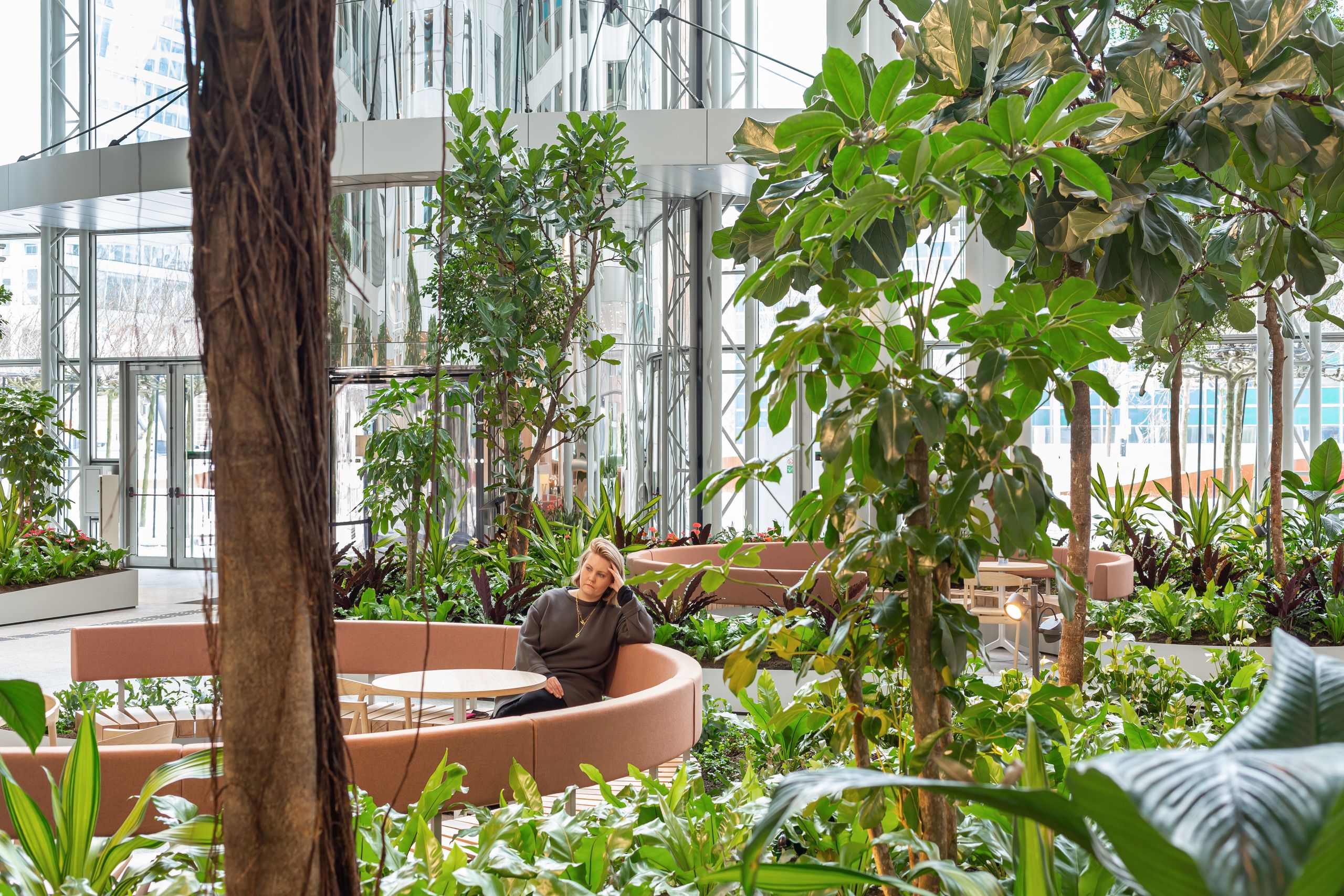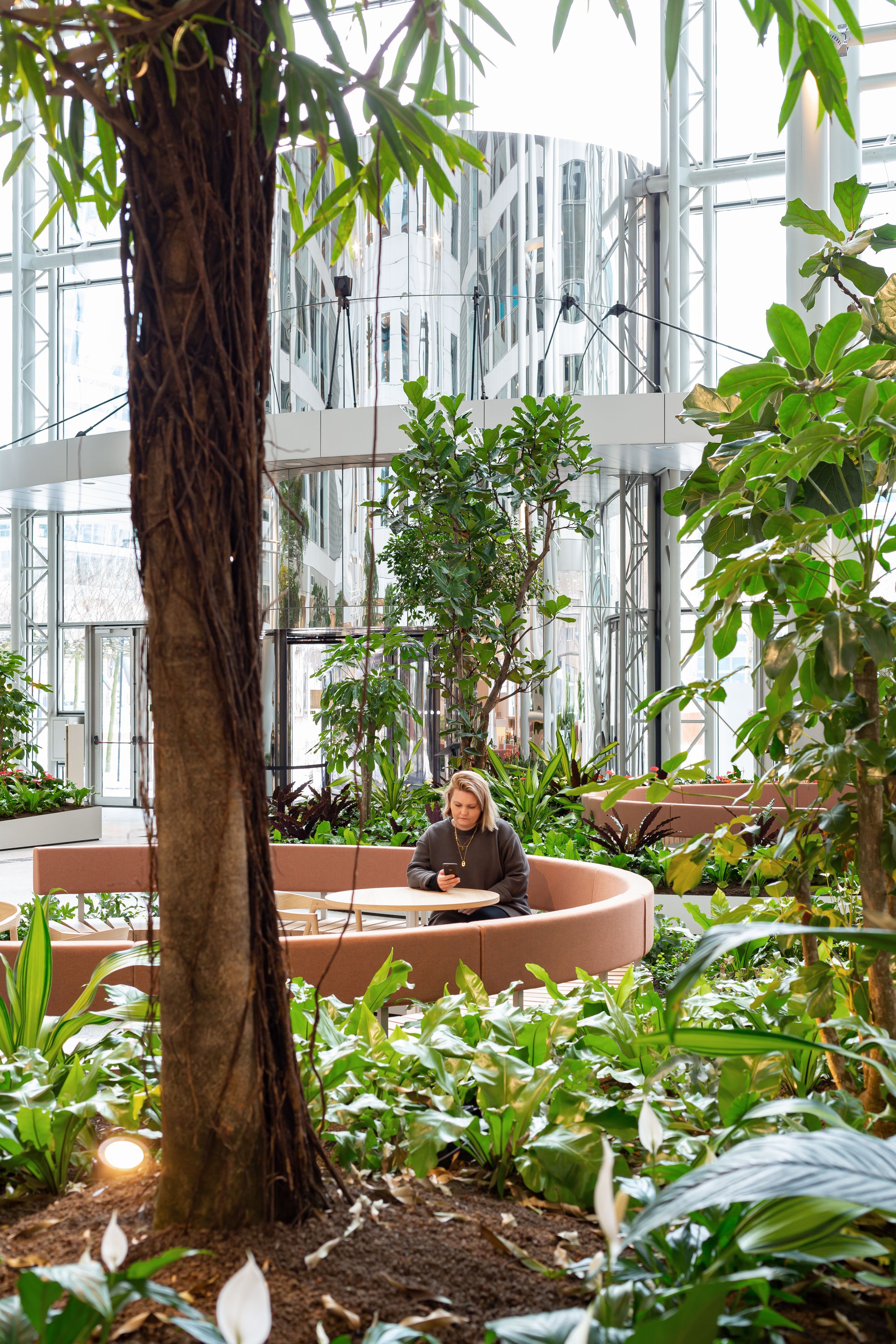 In plaats van altijd maar achter het bureau op kantoor te zitten, is er nu ruimte gemaakt om een overleg in het groene park of restaurant te houden. Het publieke café op de begane grond naast het park biedt de ruimte om te flexwerken, te overleggen met je collega’s of te lunchen met een kennis. Studies hebben laten zien dat een groene omgeving een positief effect heeft op het welzijn van de mens. Een grote groene omgeving altijd binnen handbereik in de werkomgeving komt dan erg van pas. Wanneer het werk veel stress kan opleveren, brengt het park een oase van rust.