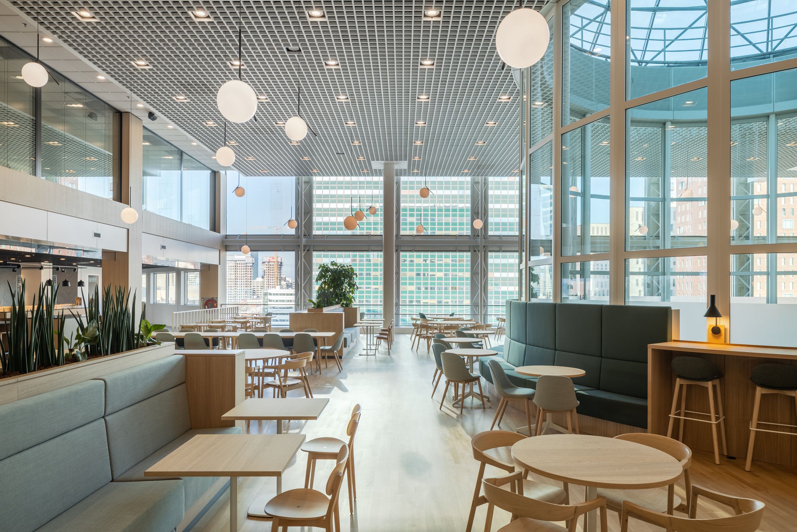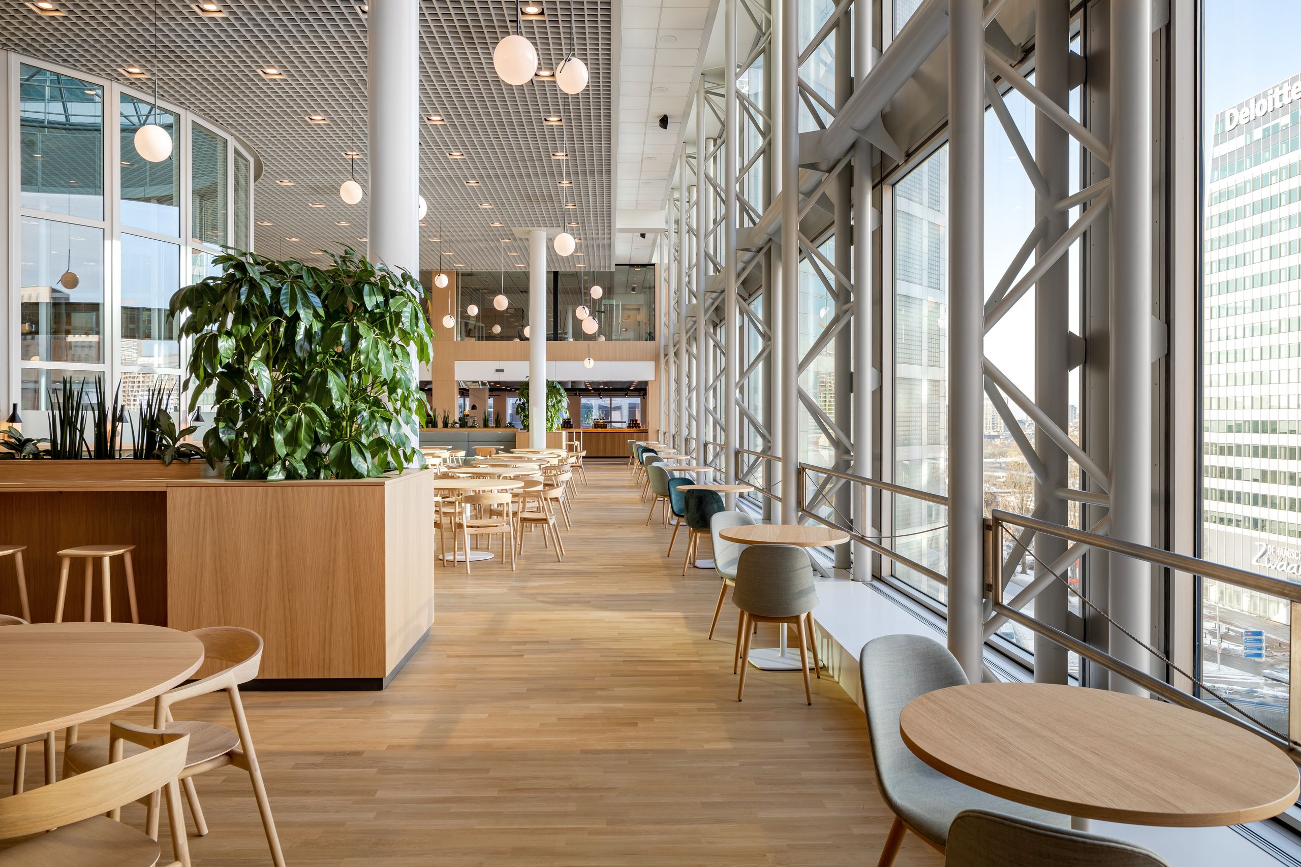 Het restaurant op de zevende etage is in beeld gebracht als een stadsplein. Op het plein van het bedrijfsrestaurant staan diverse maatwerk meubels die een diversiteit aan zitmogelijkheden bieden. Samen met de beplanting is een sfeervolle en uitnodigende omgeving gecreëerd. Het eikenhouten maatwerk wordt gecombineerd met een lichtgrijze composiet en het groen van planten. Deze elementen tezamen met het houten meubilair creëren een sfeervolle maar bovenal natuurlijke en gezonde ambiance, waarin de gebruiker zich laat inspireren. Ook het aanbod van gezond eten in de uitgifte zone speelt hierin een essentiële rol.