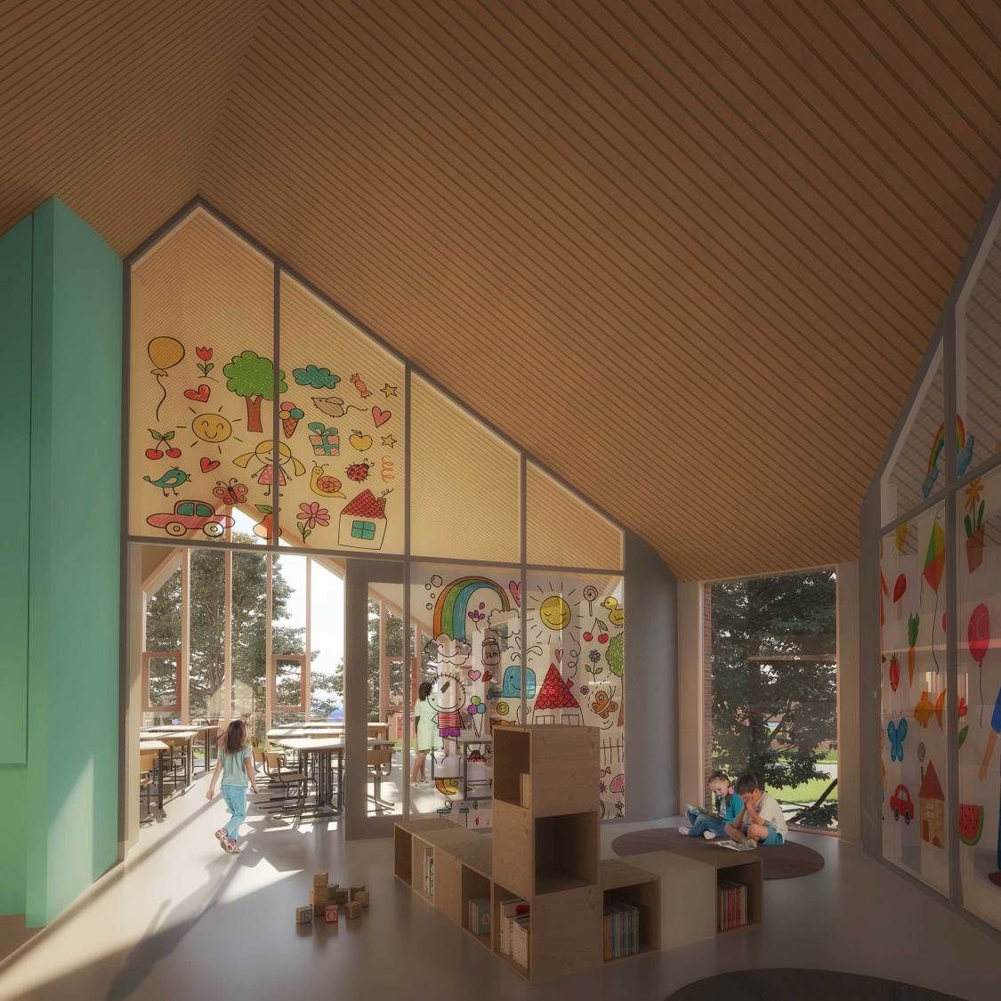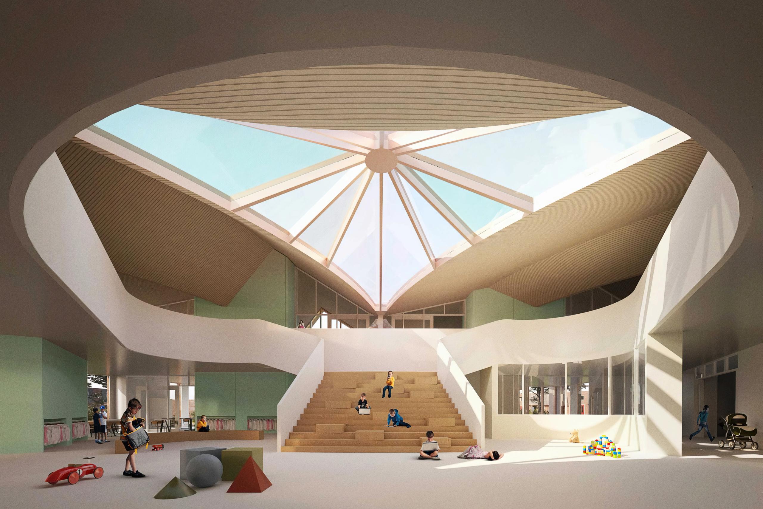 Het gebouw is van alle kanten te benaderen en heeft dus niet alleen een voor- of achterkant. De vorm van het gebouw laat ruimte over voor verschillende buitenruimtes met een groen karakter. Deze zijn een aanvulling op het groen in de omgeving, door de positieve bijdragen die ze leveren aan de biodiversiteit. De verschillende buitenruimtes kunnen verder thematisch worden ingericht, passend bij de belevingswereld van kinderen met verschillende leeftijden.