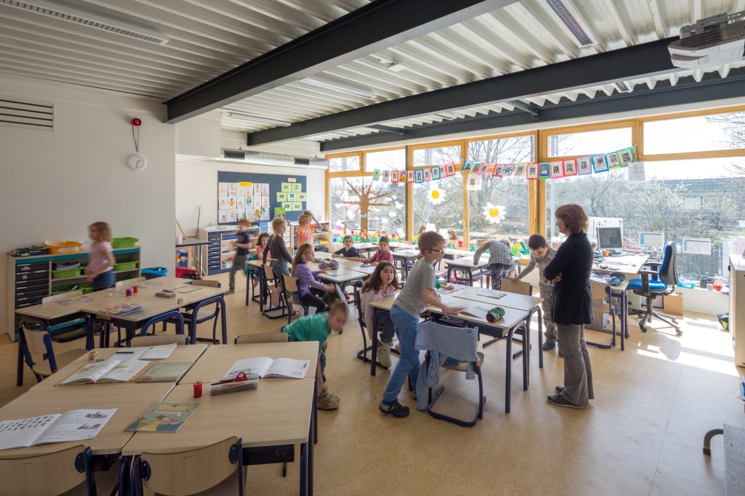 Op de begane grond zijn de middelste 3 ingenomen door de buitenschoolse opvang en het speellokaal; hierdoor ontstaat een grote centrale ruimte in de school, die op vele manieren bruikbaar is. Op de verdieping zijn alle 9 traveeën door klaslokalen ingevuld. Direct tegenover deze lokalen bevinden zich de werkpleinen, aan een verbrede gangzone.