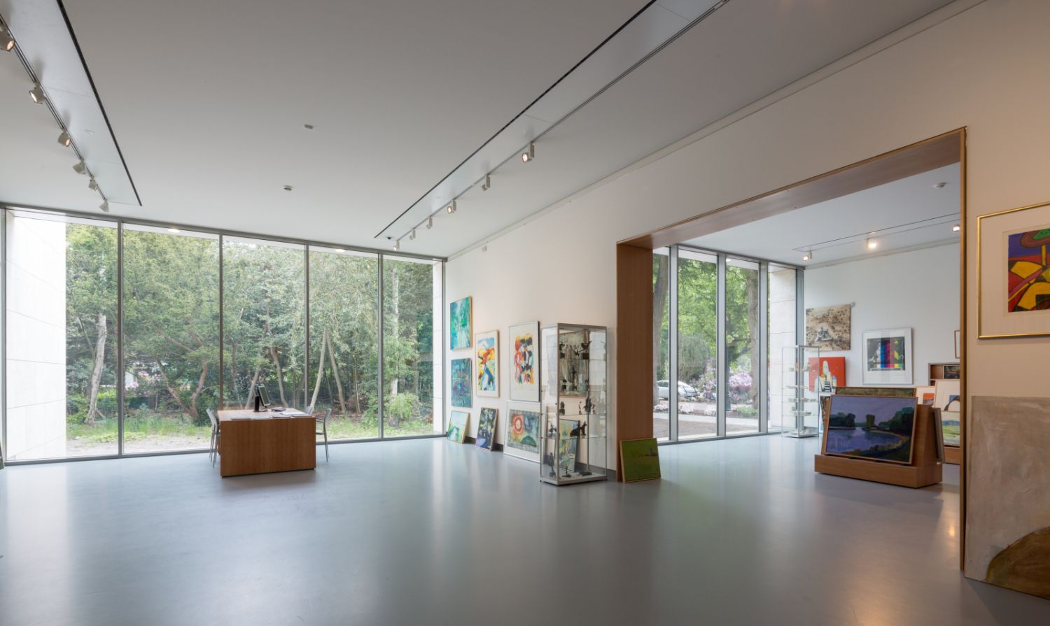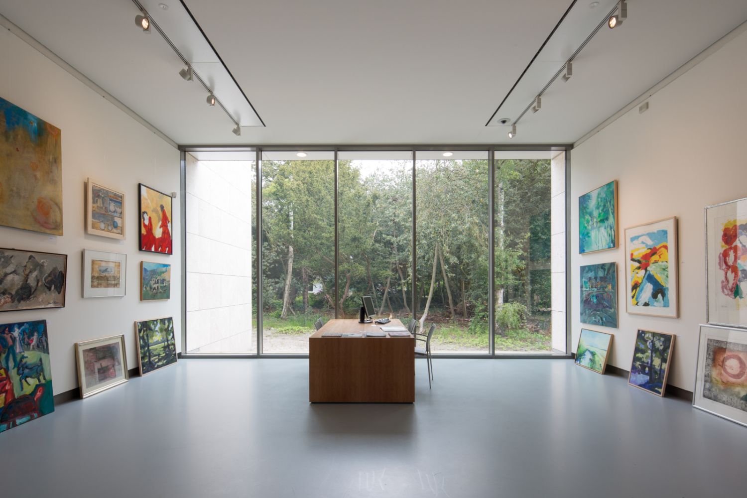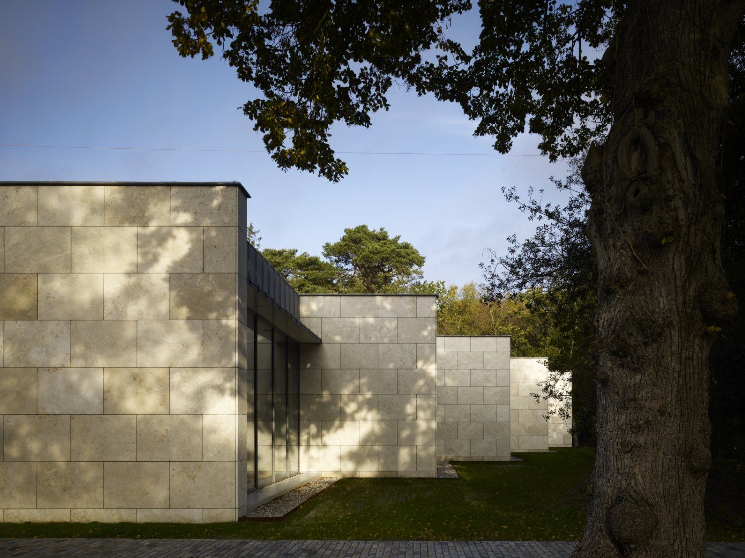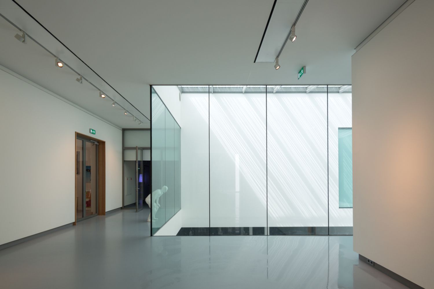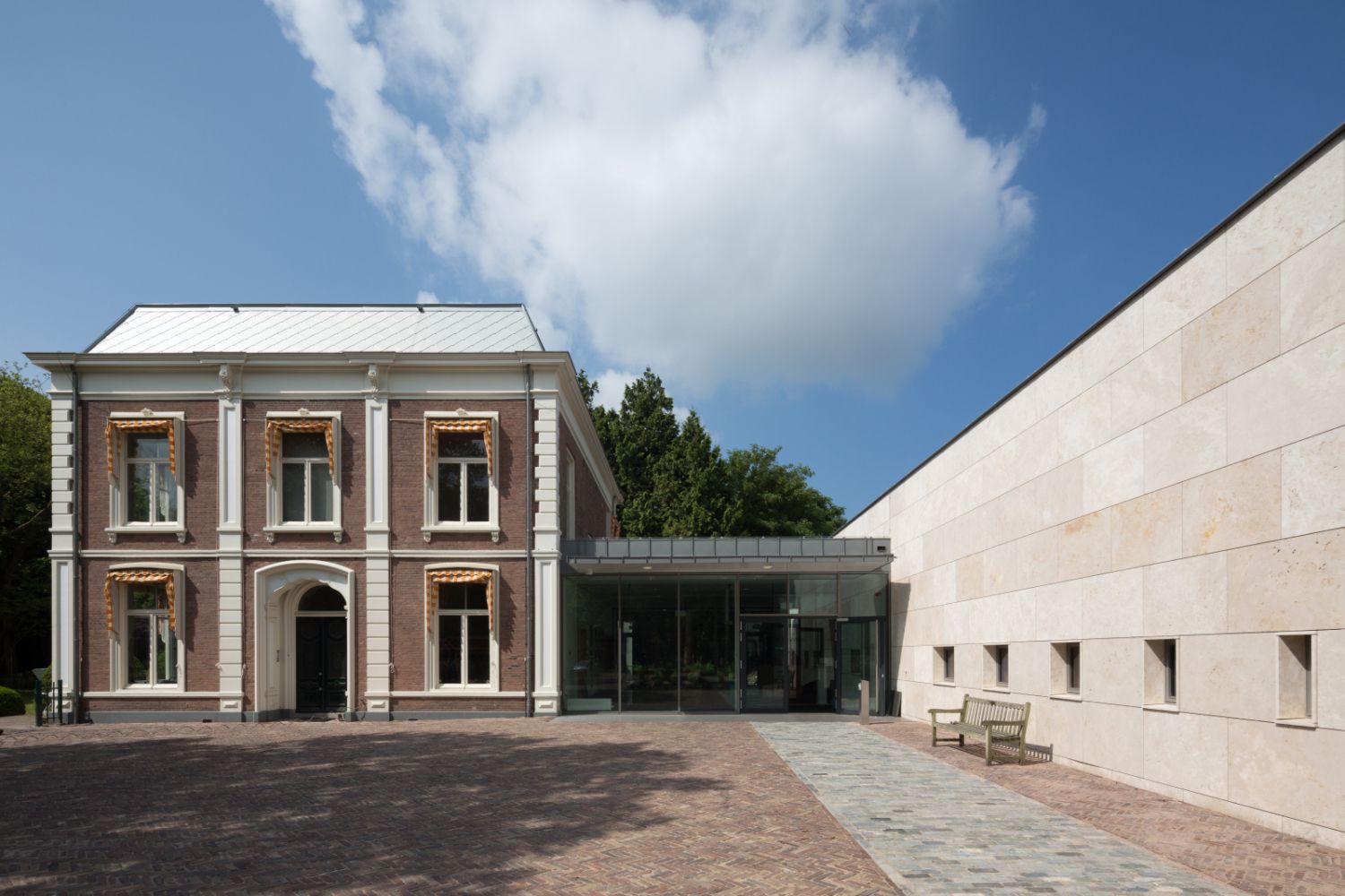 De entree ligt tussen de villa en de uitbreiding als een transparante link tussen oud en nieuw. De zaal voor tijdelijke exposities bevindt zich ondergronds, maar krijgt daglicht via een vide.