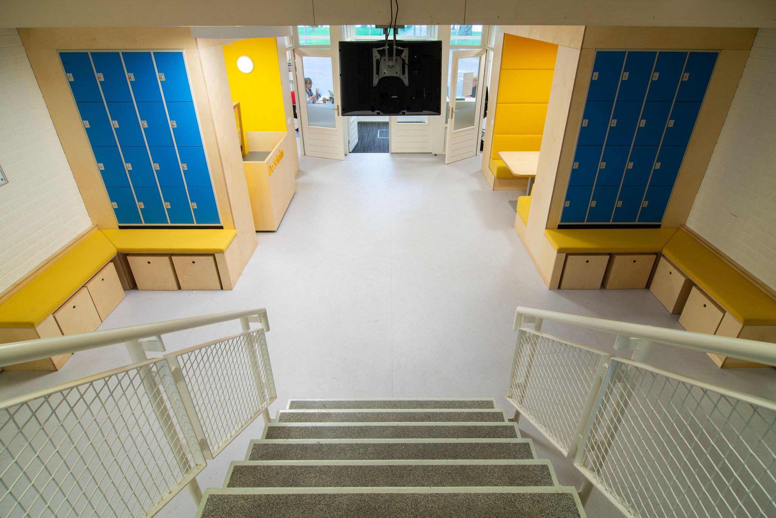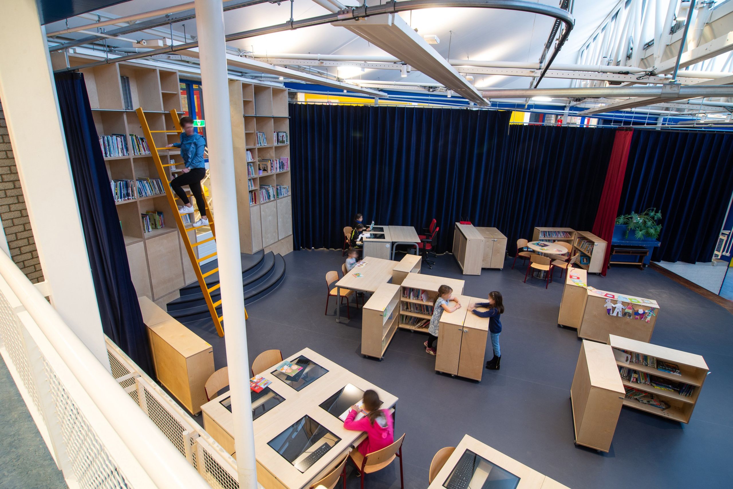 We hebben het hart van het gebouw aangepakt, de plek waar de hele school elkaar ontmoet. Hier zijn de mediatheek en het podium verbeterd en multifunctioneler gemaakt zodat er met meer kinderen, beter geleerd en opgetreden kan worden. We hebben de verlichting, de akoestiek en de luchtkwaliteit verbeterd. Zo zorgen we met duurzame materialen ook voor een gezondere school!
