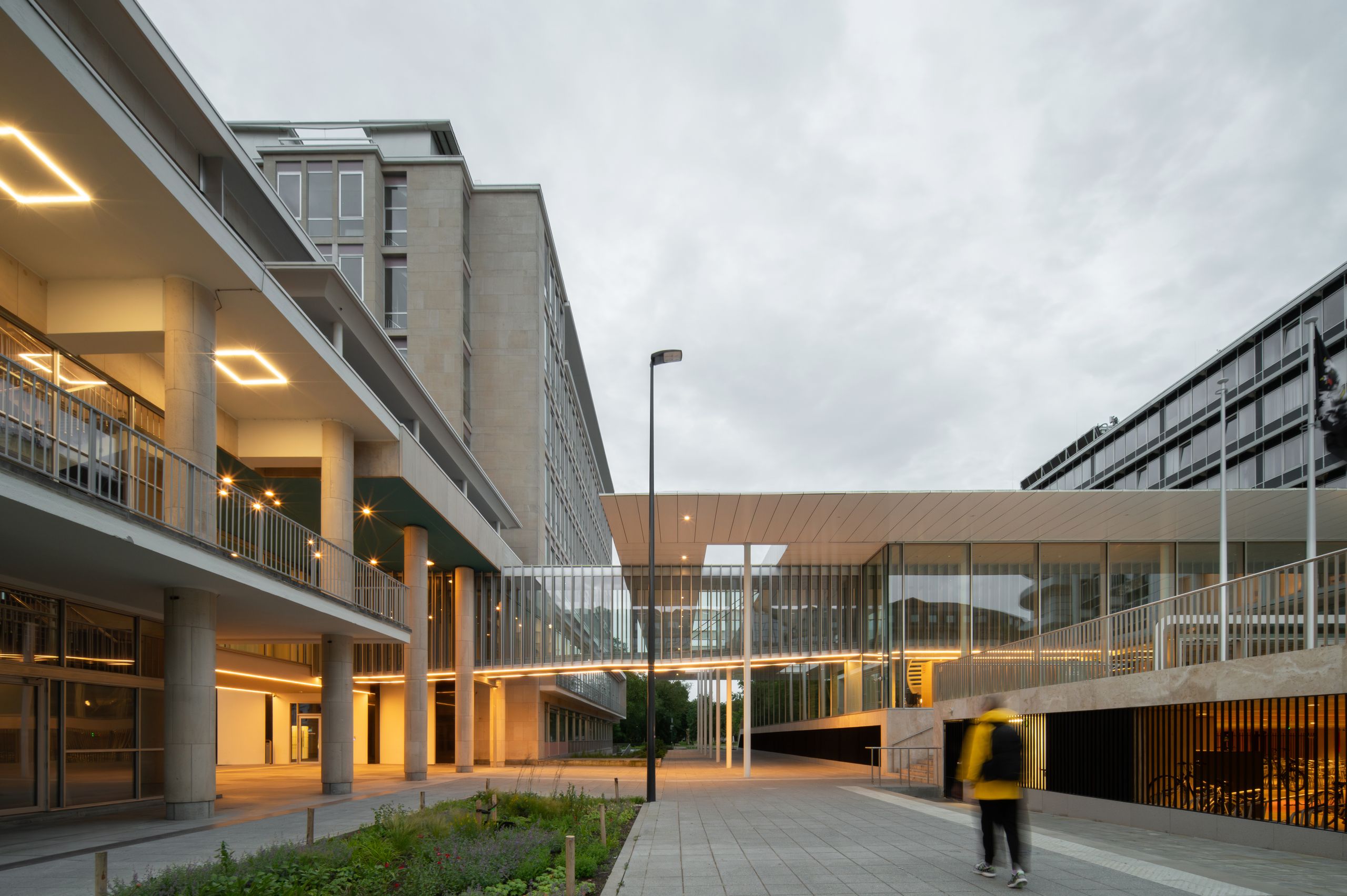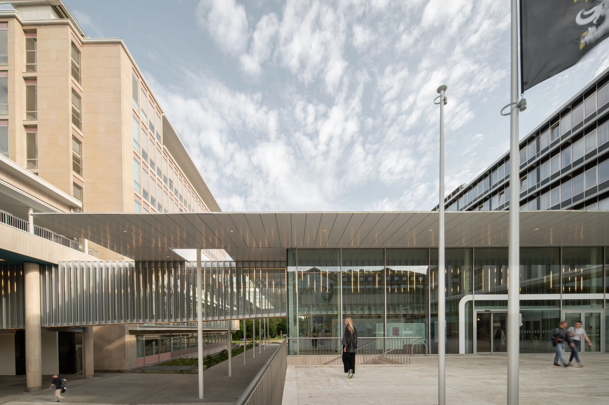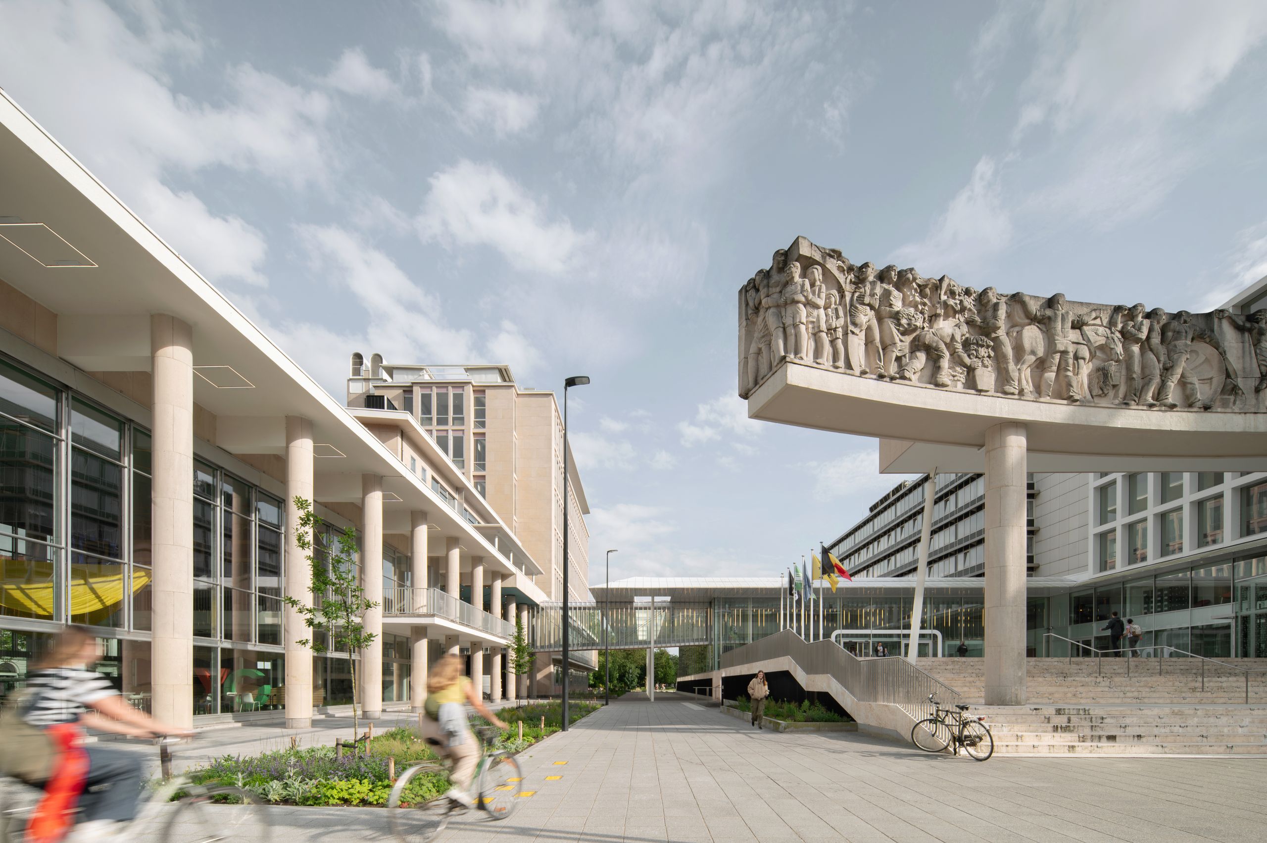 De opdracht voorzag niet in grote ingrepen in de nieuwere vleugel, wat integrale duurzaamheid beperkte. De vele vloerniveaus en de warrige logistiek bemoeilijkten een heldere oplossing. Het conceptuele antwoord is een transparante publiekshal op een grote, iets verdiepte fietsenstalling tussen beide vleugels. Deze ‘Agora’ is bereikbaar via luie trappen en een piazza onder een overkragend dak. Een functionele en flexibele ruimte die zich tegelijkertijd opent naar het park. Het EGW gebouw is verbonden door een loopbrug, een glazen navelstreng waardoor het zijn autonomie behoudt.