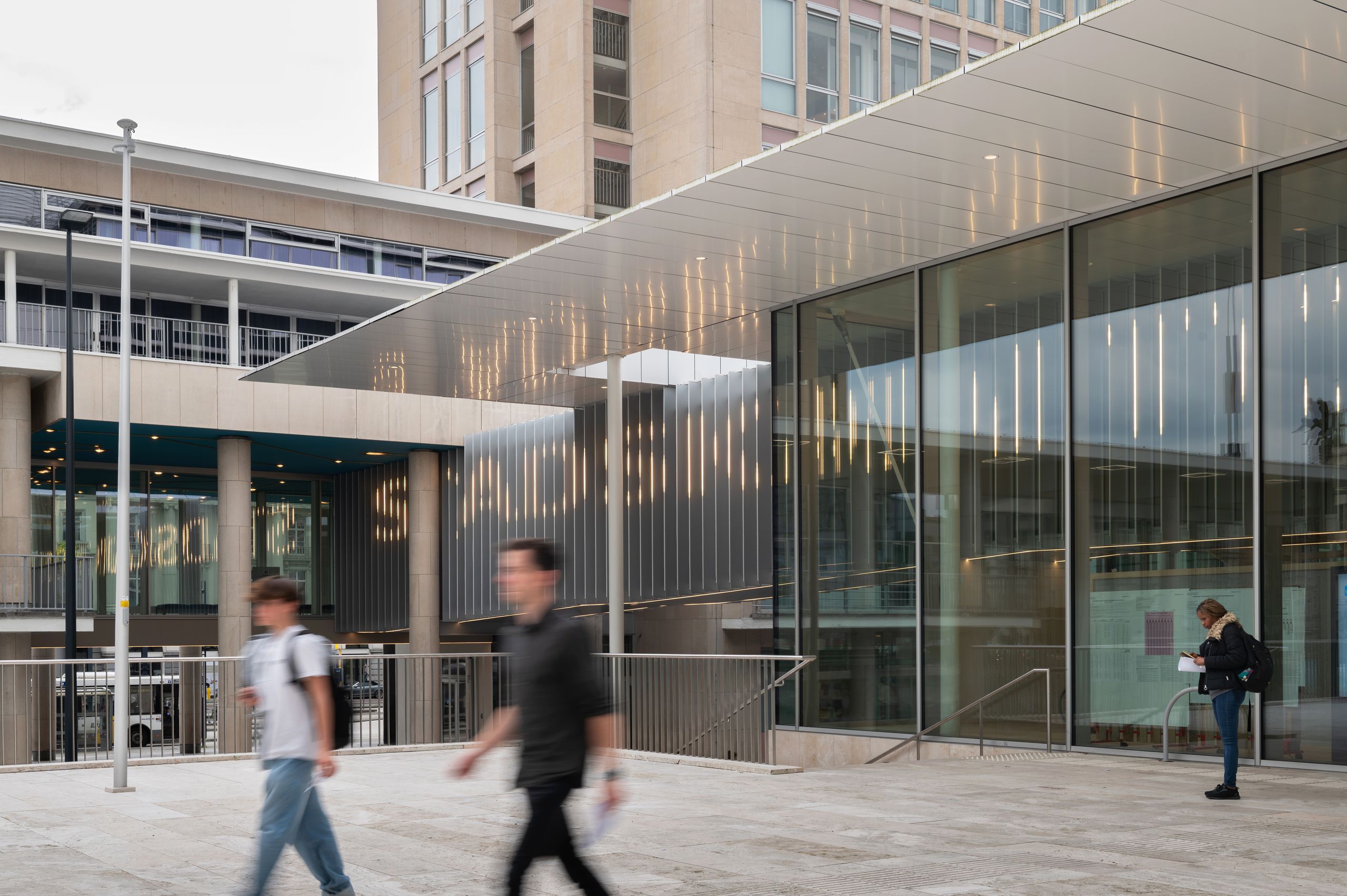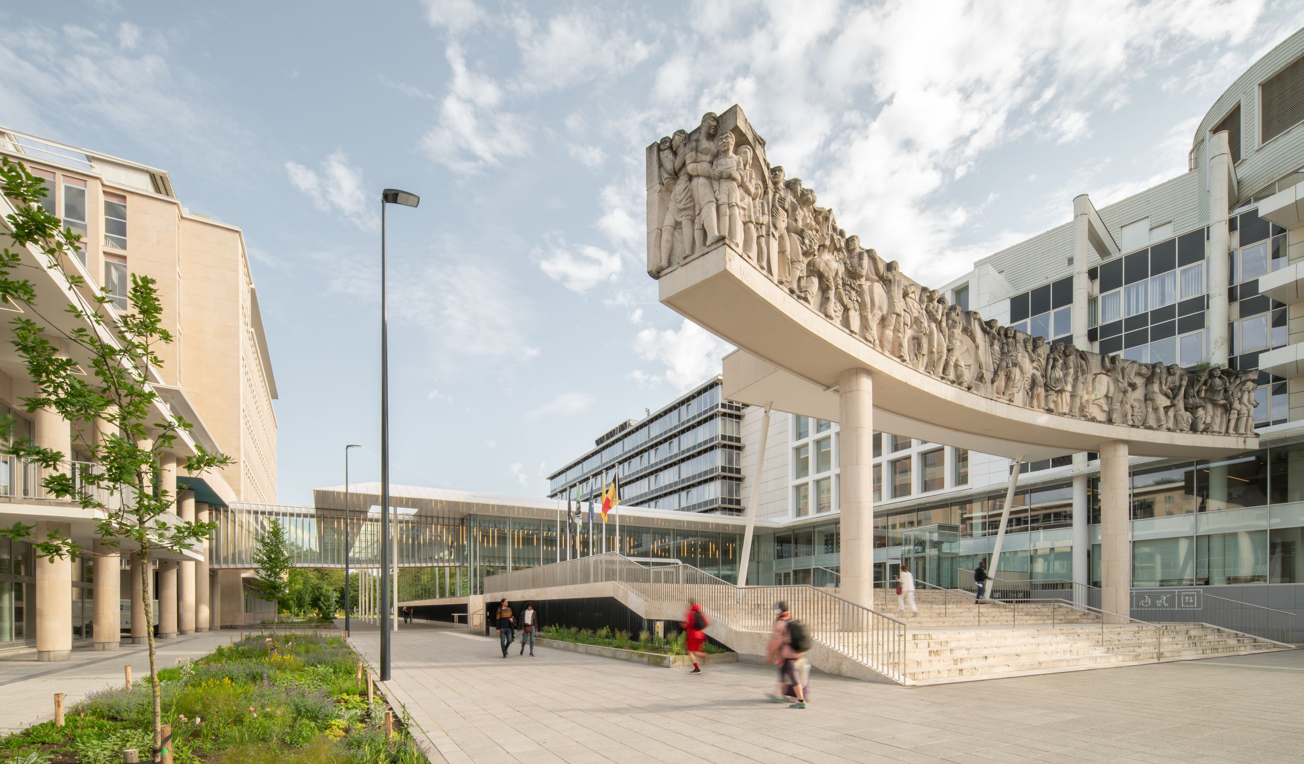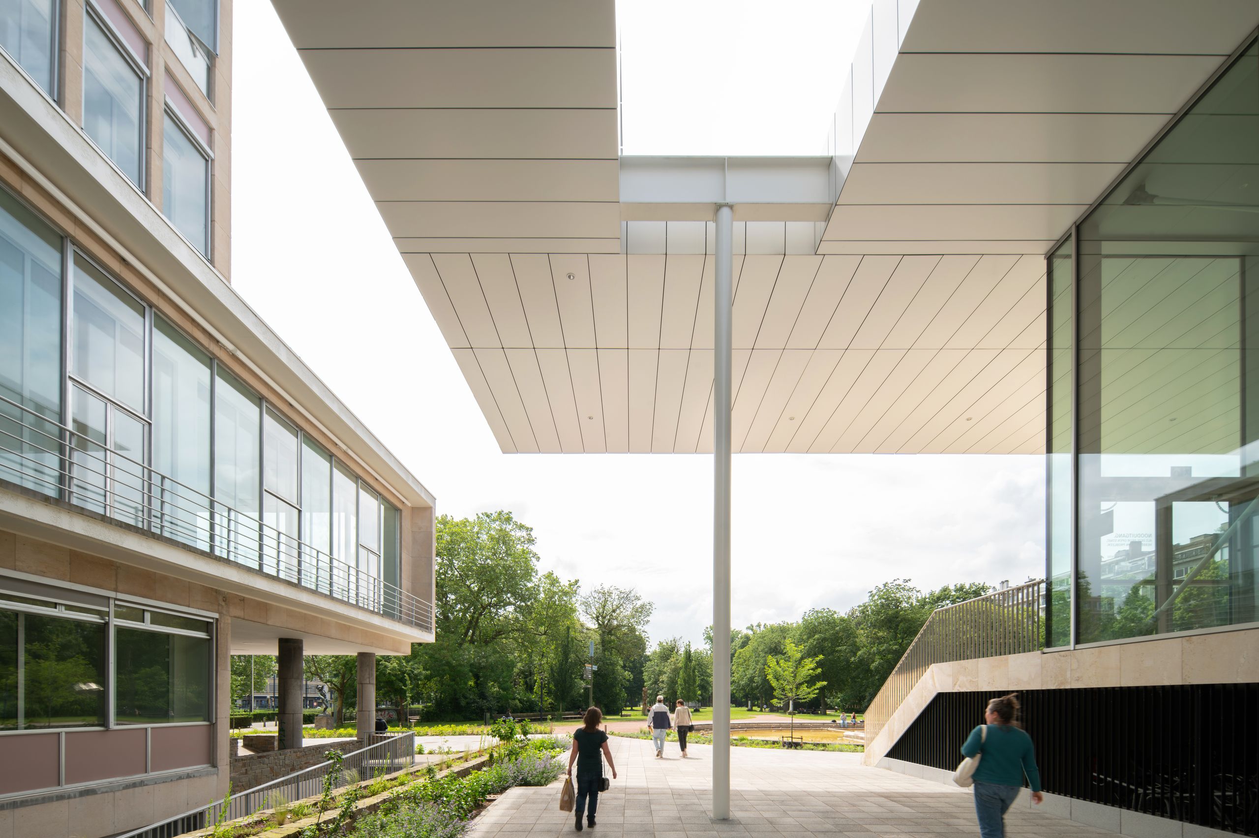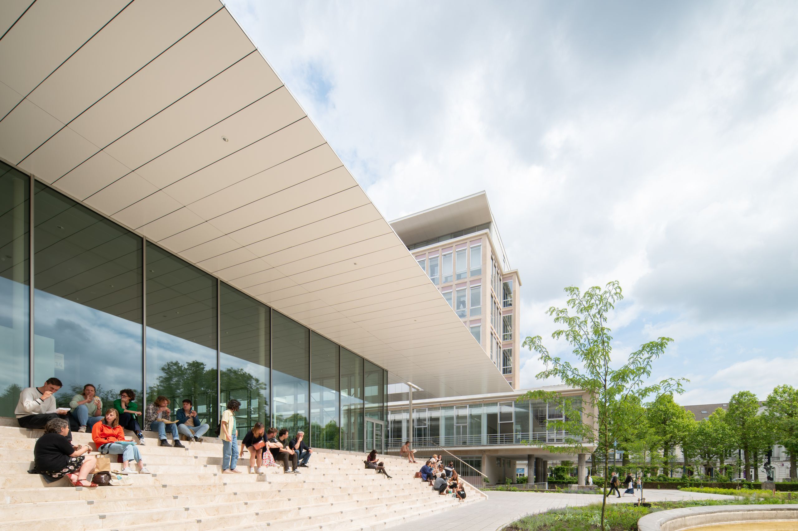 De opdracht voorzag niet in grote ingrepen in de nieuwere vleugel, wat integrale duurzaamheid beperkte. De vele vloerniveaus en de warrige logistiek bemoeilijkten een heldere oplossing. Het conceptuele antwoord is een transparante publiekshal op een grote, iets verdiepte fietsenstalling tussen beide vleugels. Deze ‘Agora’ is bereikbaar via luie trappen en een piazza onder een overkragend dak. Een functionele en flexibele ruimte die zich tegelijkertijd opent naar het park. Het EGW gebouw is verbonden door een loopbrug, een glazen navelstreng waardoor het zijn autonomie behoudt.