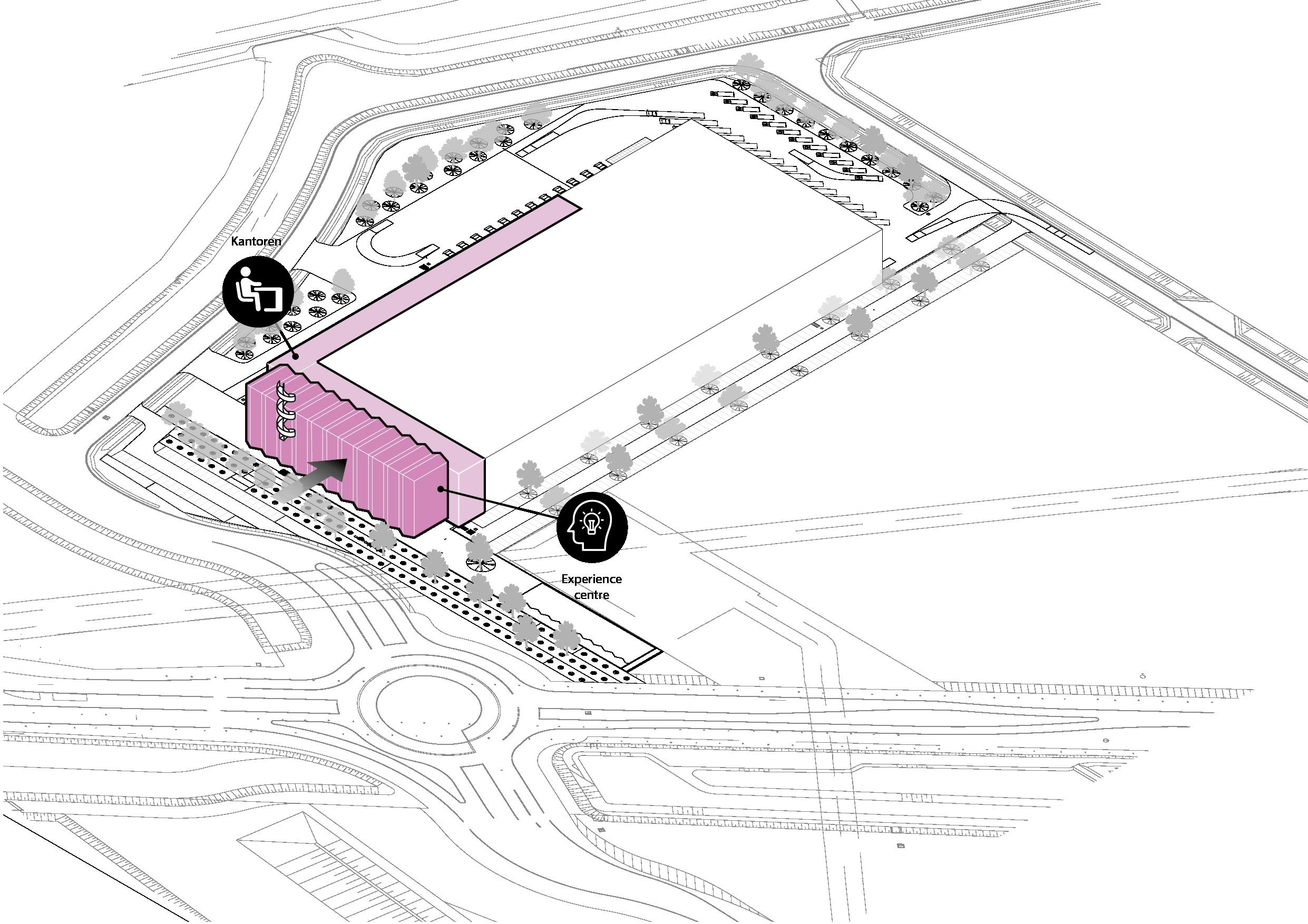 Uitgangspunt voor het ruimtelijk concept is dat de verschillende soorten functies samen één gebouw vormen. Een wit kader van 152 X 19 m verzamelt de verschillende functies in één gebaar. Aan de voorzijde is het experience centrum uitgevoerd als een glazen hal. De typisch glazen kasdaken zijn hier omgevouwen tot een gevel. Het resultaat is een enorm venster dat als een levende billboard fungeert naar de buitenwereld. Alles in het experience centrum gaat over de beleving van groente en fruit. In brede zin worden de zintuigen geprikkeld. Niet alleen visueel. Ook geur,- smaak en tast wordt gestimuleerd. Deze ervaring begint al buiten in de tuin voor de entree. Hier zorgt een “bos” van fruitbomen voor een wisseling van kleuren en geuren gedurende de verschillende seizoenen. Via de entree komt men in het experience centrum; een museale ruimte waar de wereld van groente en fruit wordt gepresenteerd. Er is hier ruimte voor presentaties en middels videowalls en vitrines wordt informatie gegeven over het bedrijfsproces van Van Gelder.