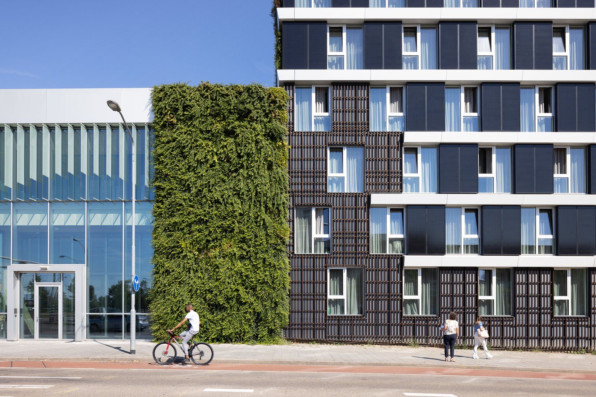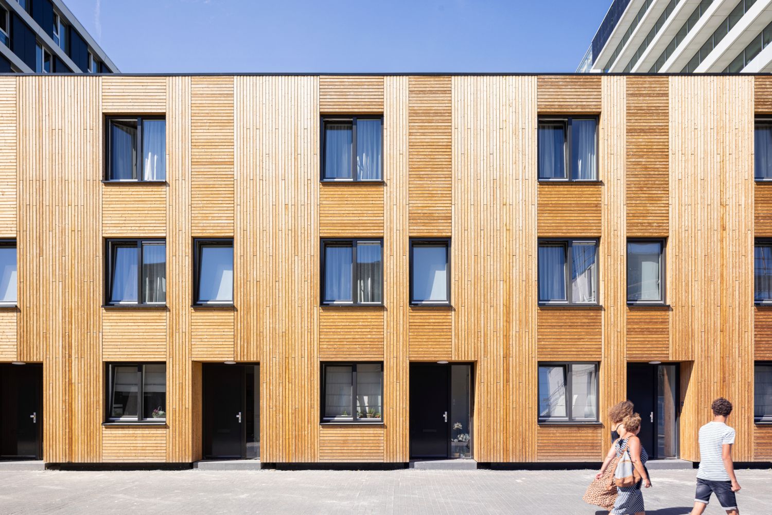 Bij het woongebouw is met hetzelfde materialenpakket gewerkt als bij het stadskantoor. Hout, groene gevels, aluminium, en het beton buiten het zicht zijn deel van deze materialen. De hoge duurzaamheidsambities zijn zichtbaar gemaakt in het gebruik van zonnepanelen in de gevels, hergebruik van Accoya delen, groene gevels en het gemeenschappelijk gebruik van de buitenruimten. Hiermee wordt op energetisch vlak vooruit gelopen op de nieuwe wet- en regelgeving om het gebouw nu al aan de nieuwe BENG-3-eisen te laten voldoen.